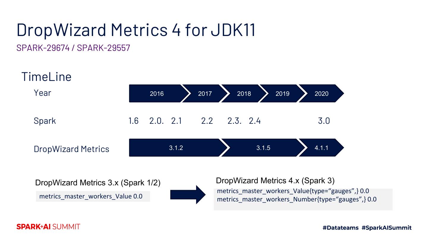 13 .DropWizard Metrics 4 for JDK11 SPARK-29674 / SPARK-29557 TimeLine Year 2016 2017 2018 2019 2020 Spark 1.6 2.0. 2.1 2.2 2.3. 2.4 3.0 DropWizard Metrics 3.1.2 3.1.5 4.1.1 DropWizard Metrics 3.x (Spark 1/2) DropWizard Metrics 4.x (Spark 3) metrics_master_workers_Value{type=“gauges”,} 0.0 metrics_master_workers_Value 0.0 metrics_master_workers_Number{type=“gauges”,} 0.0