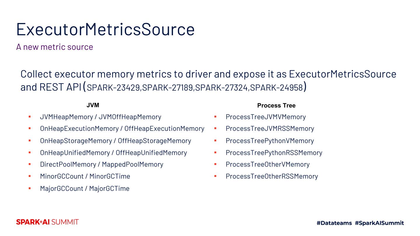 14 .ExecutorMetricsSource A new metric source Collect executor memory metrics to driver and expose it as ExecutorMetricsSource and REST API (SPARK-23429,SPARK-27189,SPARK-27324,SPARK-24958) JVM Process Tree ▪ JVMHeapMemory / JVMOffHeapMemory ▪ ProcessTreeJVMVMemory ▪ OnHeapExecutionMemory / OffHeapExecutionMemory ▪ ProcessTreeJVMRSSMemory ▪ OnHeapStorageMemory / OffHeapStorageMemory ▪ ProcessTreePythonVMemory ▪ OnHeapUnifiedMemory / OffHeapUnifiedMemory ▪ ProcessTreePythonRSSMemory ▪ DirectPoolMemory / MappedPoolMemory ▪ ProcessTreeOtherVMemory ▪ MinorGCCount / MinorGCTime ▪ ProcessTreeOtherRSSMemory ▪ MajorGCCount / MajorGCTime
