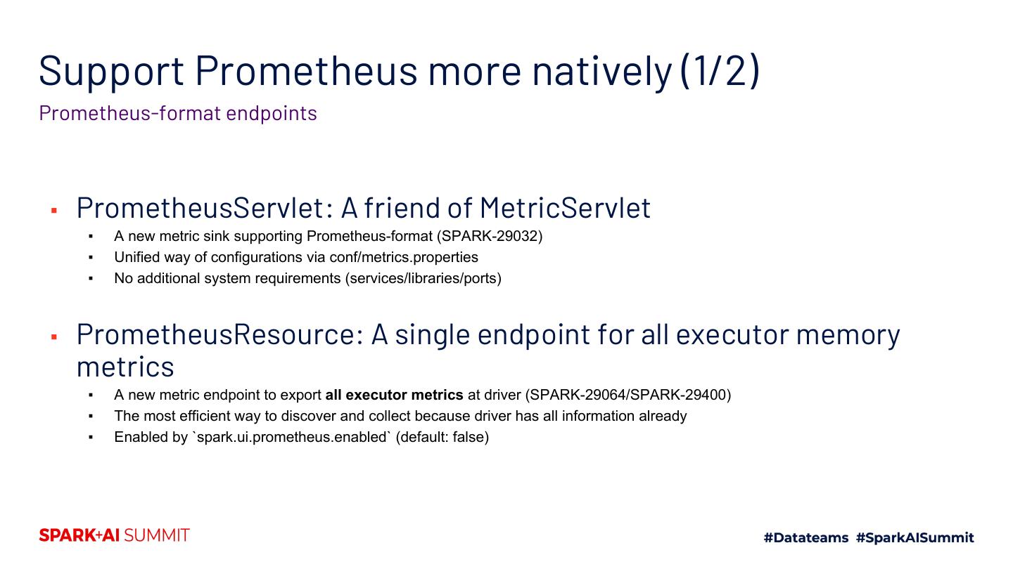 15 .Support Prometheus more natively (1/2) Prometheus-format endpoints ▪ PrometheusServlet: A friend of MetricServlet ▪ A new metric sink supporting Prometheus-format (SPARK-29032) ▪ Unified way of configurations via conf/metrics.properties ▪ No additional system requirements (services/libraries/ports) ▪ PrometheusResource: A single endpoint for all executor memory metrics ▪ A new metric endpoint to export all executor metrics at driver (SPARK-29064/SPARK-29400) ▪ The most efficient way to discover and collect because driver has all information already ▪ Enabled by `spark.ui.prometheus.enabled` (default: false)