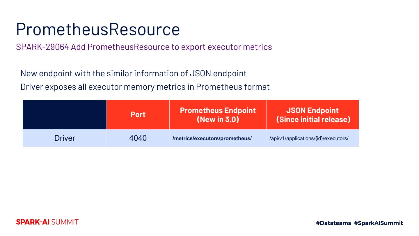 21 .PrometheusResource SPARK-29064 Add PrometheusResource to export executor metrics New endpoint with the similar information of JSON endpoint Driver exposes all executor memory metrics in Prometheus format Prometheus Endpoint JSON Endpoint Port (New in 3.0) (Since initial release) Driver 4040 /metrics/executors/prometheus/ /api/v1/applications/{id}/executors/
