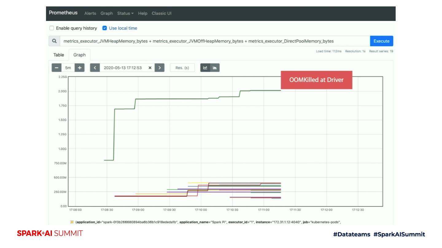 26 .Monitoring batch job memory behavior (2/2) spark-submit –master k8s://$K8S_MASTER_URL –deploy-mode cluster \ -c spark.driver.memory=2g \ -c spark.executor.instances=30 \ -c spark.ui.prometheus.enabled=true \ -c spark.kubernetes.driver.annotation.prometheus.io/scrape=true \ -c spark.kubernetes.driver.annotation.prometheus.io/path=/metrics/executors/prometheus/ \ -c spark.kubernetes.driver.annotation.prometheus.io/port=4040 \ -c spark.kubernetes.container.image=$spark_image \ --class org.apache.spark.examples.SparkPi \ local:///path/to/spark-examples_xx.jar 200000