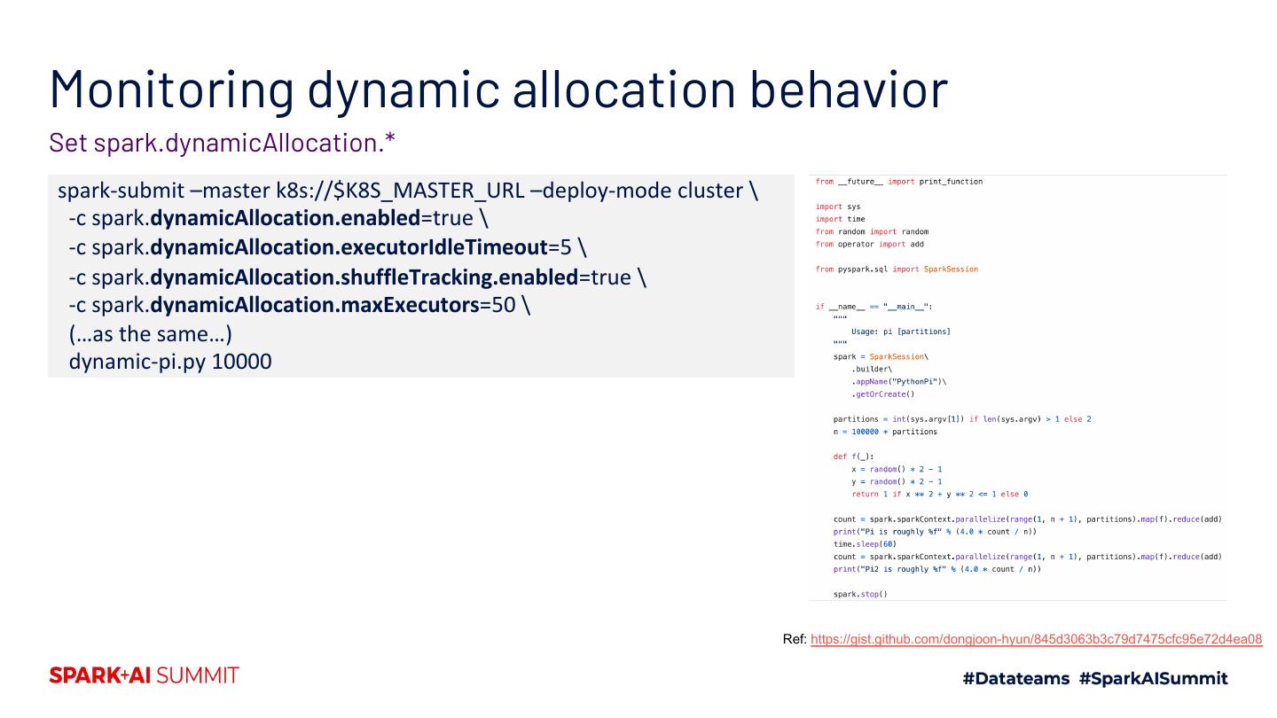 28 .Monitoring dynamic allocation behavior Set spark.dynamicAllocation.* spark-submit –master k8s://$K8S_MASTER_URL –deploy-mode cluster \ -c spark.dynamicAllocation.enabled=true \ -c spark.dynamicAllocation.executorIdleTimeout=5 \ -c spark.dynamicAllocation.shuffleTracking.enabled=true \ -c spark.dynamicAllocation.maxExecutors=50 \ (…as the same…) dynamic-pi.py 10000 Ref: https://gist.github.com/dongjoon-hyun/845d3063b3c79d7475cfc95e72d4ea08