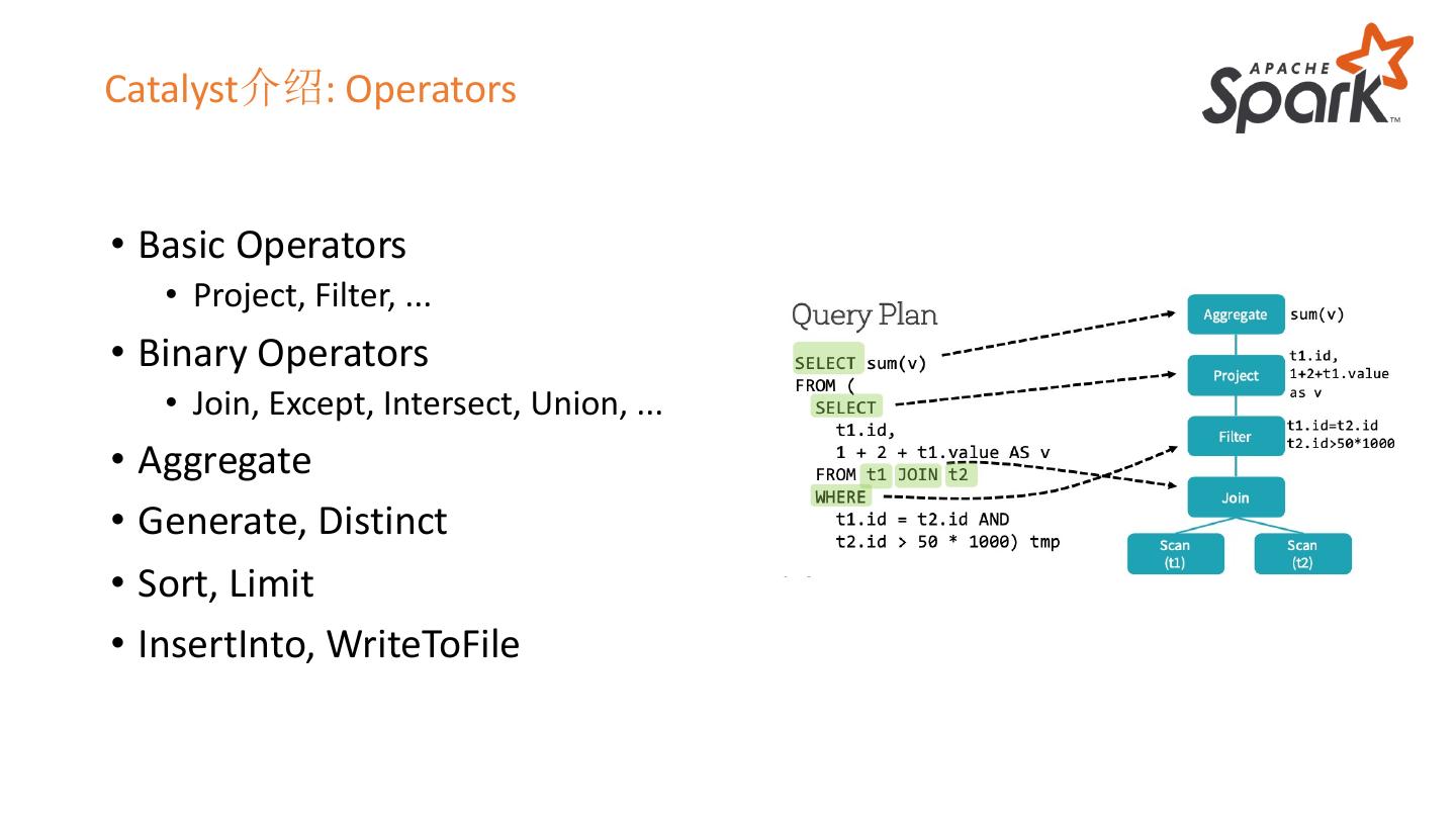 14 .Catalyst介绍: Operators • Basic Operators • Project, Filter, ... • Binary Operators • Join, Except, Intersect, Union, ... • Aggregate • Generate, Distinct • Sort, Limit • InsertInto, WriteToFile