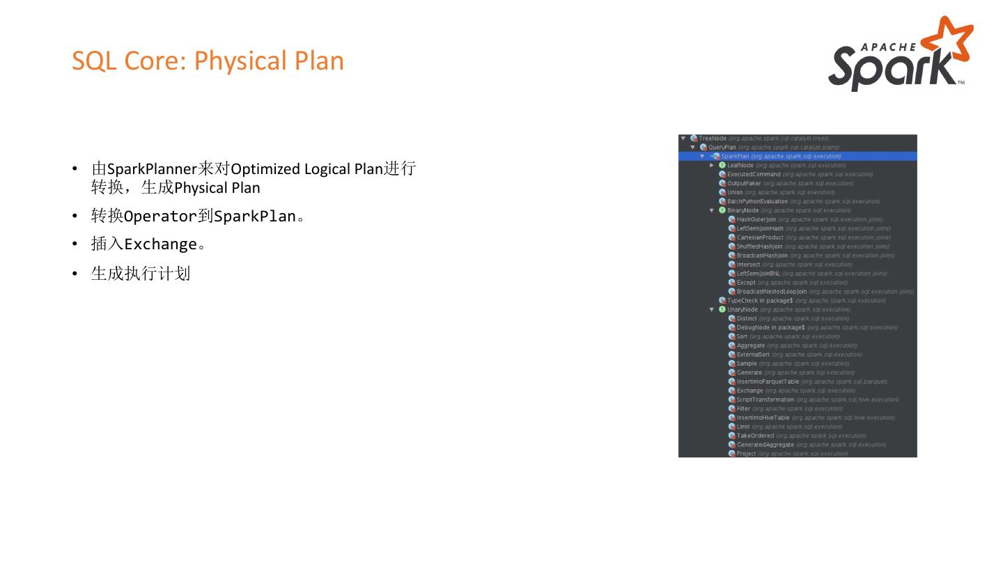 23 .SQL Core: Physical Plan • 由SparkPlanner来对Optimized Logical Plan进行 转换,生成Physical Plan • 转换Operator到SparkPlan。 • 插入Exchange。 • 生成执行计划