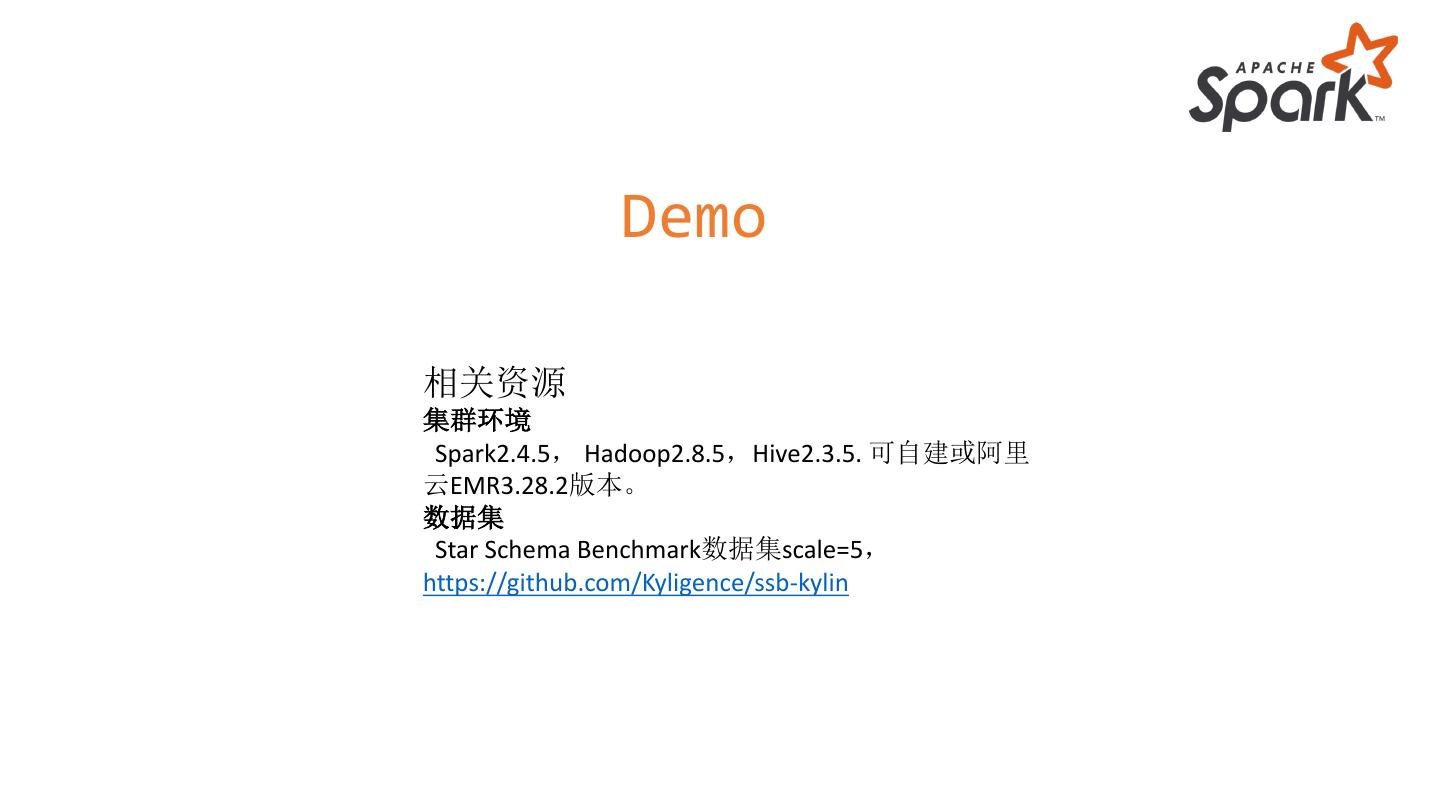 25 . Demo 相关资源 集群环境 Spark2.4.5, Hadoop2.8.5,Hive2.3.5. 可自建或阿里 云EMR3.28.2版本。 数据集 Star Schema Benchmark数据集scale=5, https://github.com/Kyligence/ssb-kylin