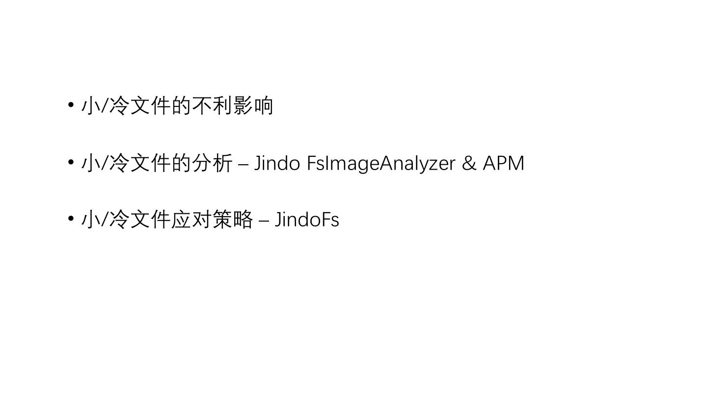 3 .• 小/冷文件的不利影响 • 小/冷文件的分析 – Jindo FsImageAnalyzer & APM • 小/冷文件应对策略 – JindoFs