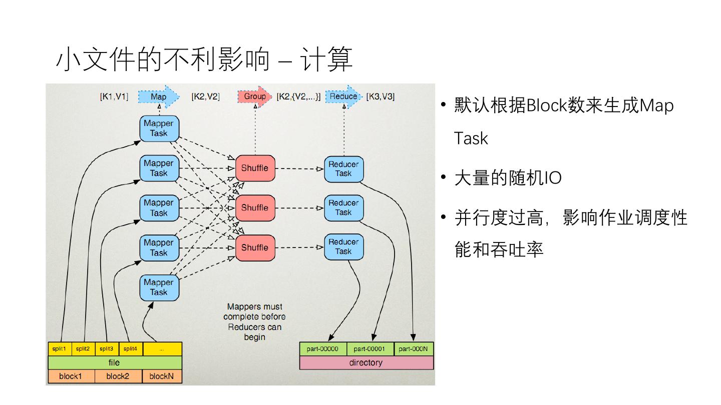 7 .小文件的不利影响 – 计算 • 默认根据Block数来生成Map Task • 大量的随机IO • 并行度过高,影响作业调度性 能和吞吐率