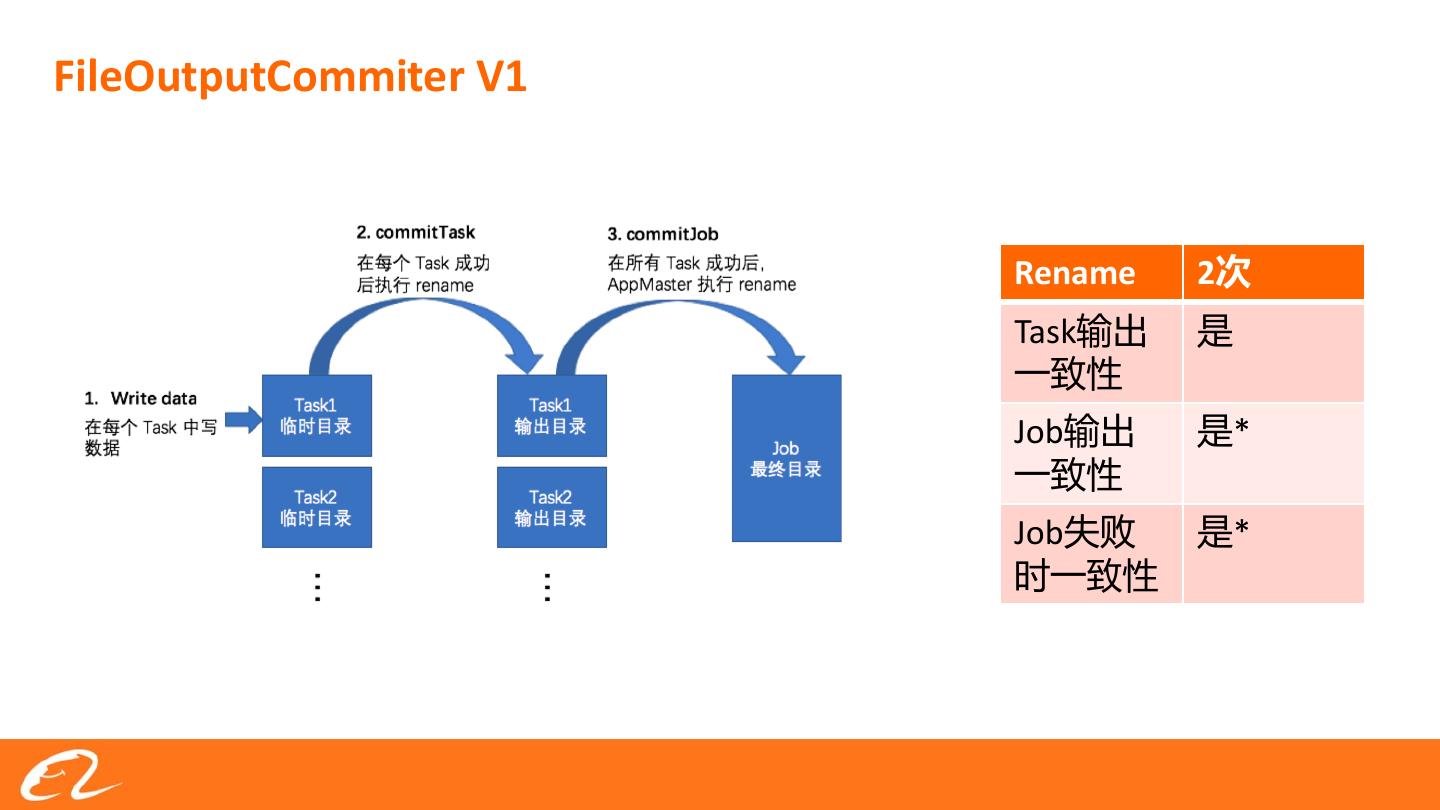 6 .FileOutputCommiter V1 Rename 2次 Task输出 是 一致性 Job输出 是* 一致性 Job失败 是* 时一致性