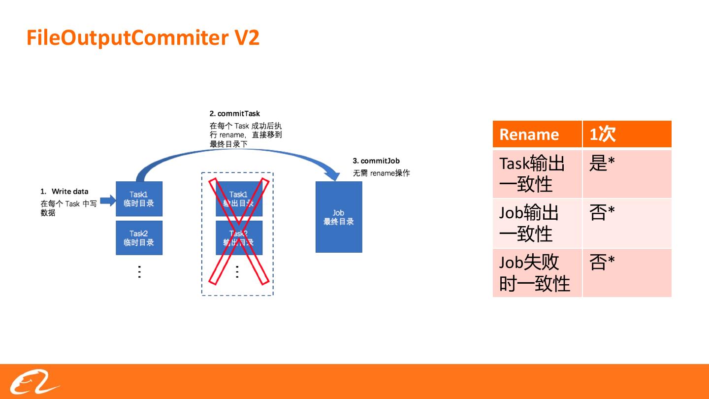 7 .FileOutputCommiter V2 Rename 1次 Task输出 是* 一致性 Job输出 否* 一致性 Job失败 否* 时一致性