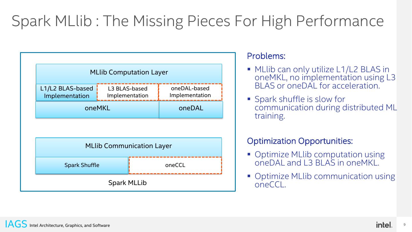 9 . Spark MLlib : The Missing Pieces For High Performance Problems: MLlib Computation Layer ▪ MLlib can only utilize L1/L2 BLAS in oneMKL, no implementation using L3 L1/L2 BLAS-based L3 BLAS-based oneDAL-based BLAS or oneDAL for acceleration. Implementation Implementation Implementation ▪ Spark shuffle is slow for oneMKL oneDAL communication during distributed ML training. Optimization Opportunities: MLlib Communication Layer ▪ Optimize MLlib computation using Spark Shuffle oneCCL oneDAL and L3 BLAS in oneMKL. ▪ Optimize MLlib communication using Spark MLLib oneCCL. IAGS Intel Architecture, Graphics, and Software 9