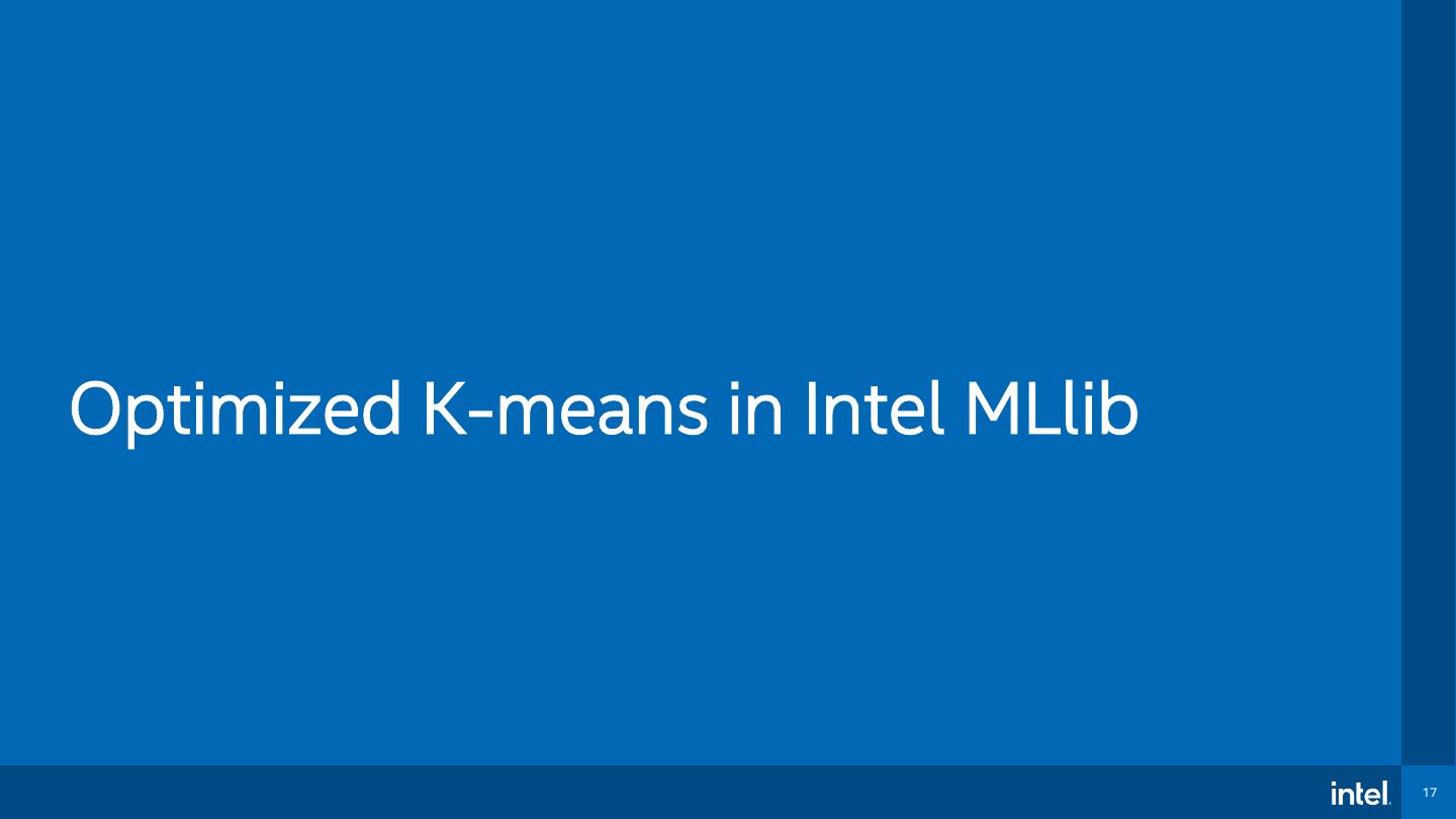 16 . Distributed Training in Intel MLlib Spark MLlib Intel MLlib Multiple Spark map/reduce stages for A single Spark stage for distributed distributed training using Spark shuffle training using oneCCL for communication. for communication. Stage1 Stage2 Stage3 Stage4 Stage1 Stage2 Executor Executor oneCCL Executor Executor oneCCL Executor Executor Spark Spark Shuffle Shuffle Distributed Training Distributed Training IAGS Intel Architecture, Graphics, and Software 16