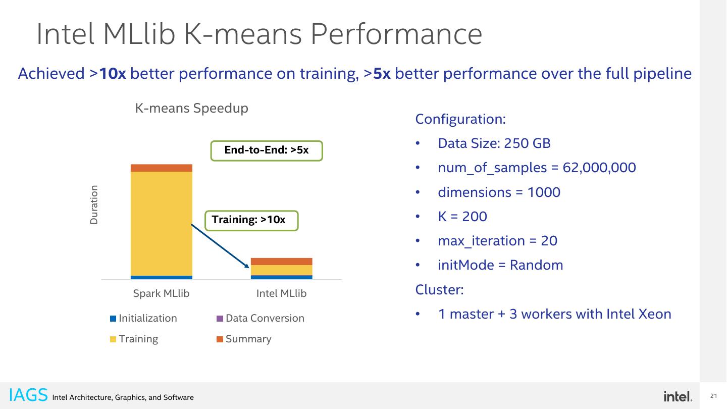 20 . Fallback Strategy in Intel MLlib ▪ Fallback to Spark MLlib if features or parameters are not supported by oneDAL. ▪ In K-means, oneDAL doesn't support cosine distance and weighted points. If these parameters are used, Intel MLlib will fallback to Spark MLlib. class pyspark.ml.clustering.KMeans(featuresCol='features’, predictionCol='prediction', k=2, initMode='k-means||', initSteps=2, tol=0.0001, maxIter=20, seed=None, distanceMeasure='euclidean', weightCol=None) Call Spark MLlib DistanceMeasure K-means == “cosine” || Yes weightCol.nonEm No pty Call Intel MLlib K-means IAGS Intel Architecture, Graphics, and Software 20