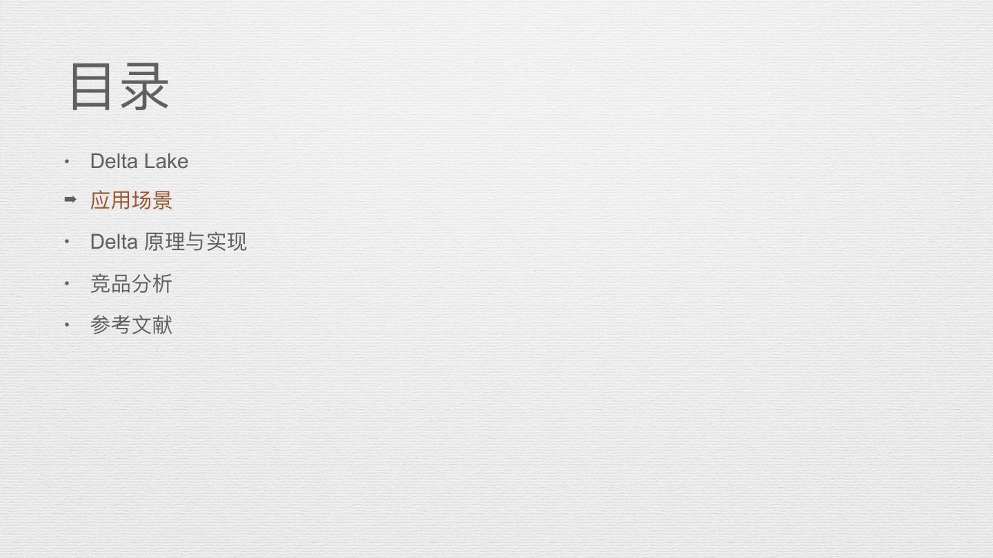 2 .⽬目录 • Delta Lake • 应⽤用场景 • Delta 原理理与实现 • 竞品分析 • 参考⽂文献