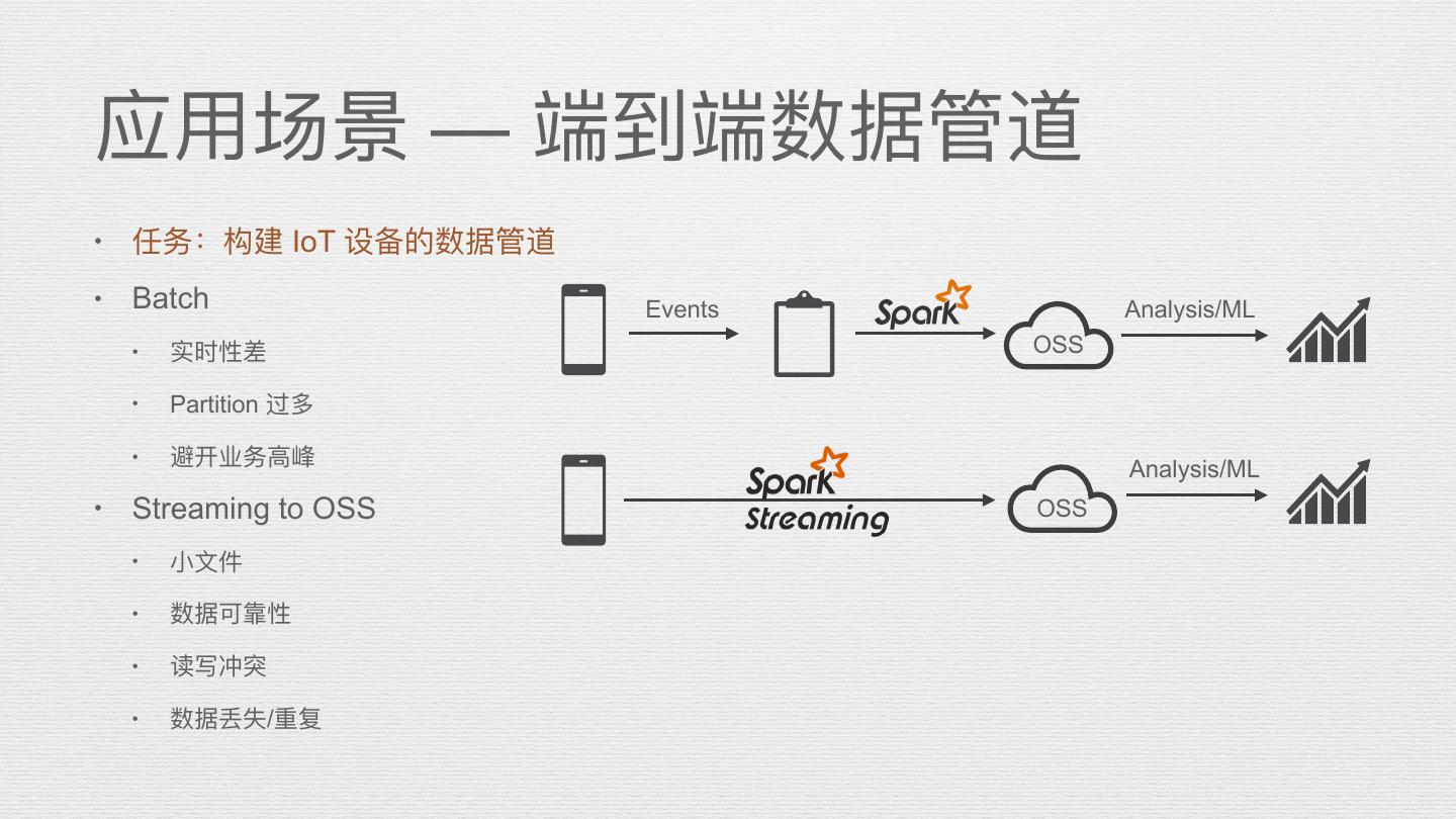 9 .应⽤用场景 — 端到端数据管道 • 任务:构建 IoT 设备的数据管道 • Batch Events Analysis/ML • 实时性差 OSS • Partition 过多 • 避开业务⾼高峰 Analysis/ML • Streaming to OSS OSS • ⼩小⽂文件 • 数据可靠性 • 读写冲突 • 数据丢失/重复