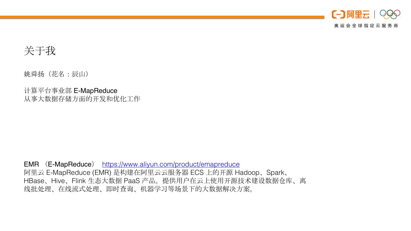 3 .关于我 姚舜扬(花名:辰山) 计算平台事业部 E-MapReduce 从事大数据存储方面的开发和优化工作 EMR (E-MapReduce) https://www.aliyun.com/product/emapreduce 阿里云 E-MapReduce (EMR) 是构建在阿里云云服务器 ECS 上的开源 Hadoop、Spark、 HBase、Hive、Flink 生态大数据 PaaS 产品。提供用户在云上使用开源技术建设数据仓库、离 线批处理、在线流式处理、即时查询、机器学习等场景下的大数据解决方案。