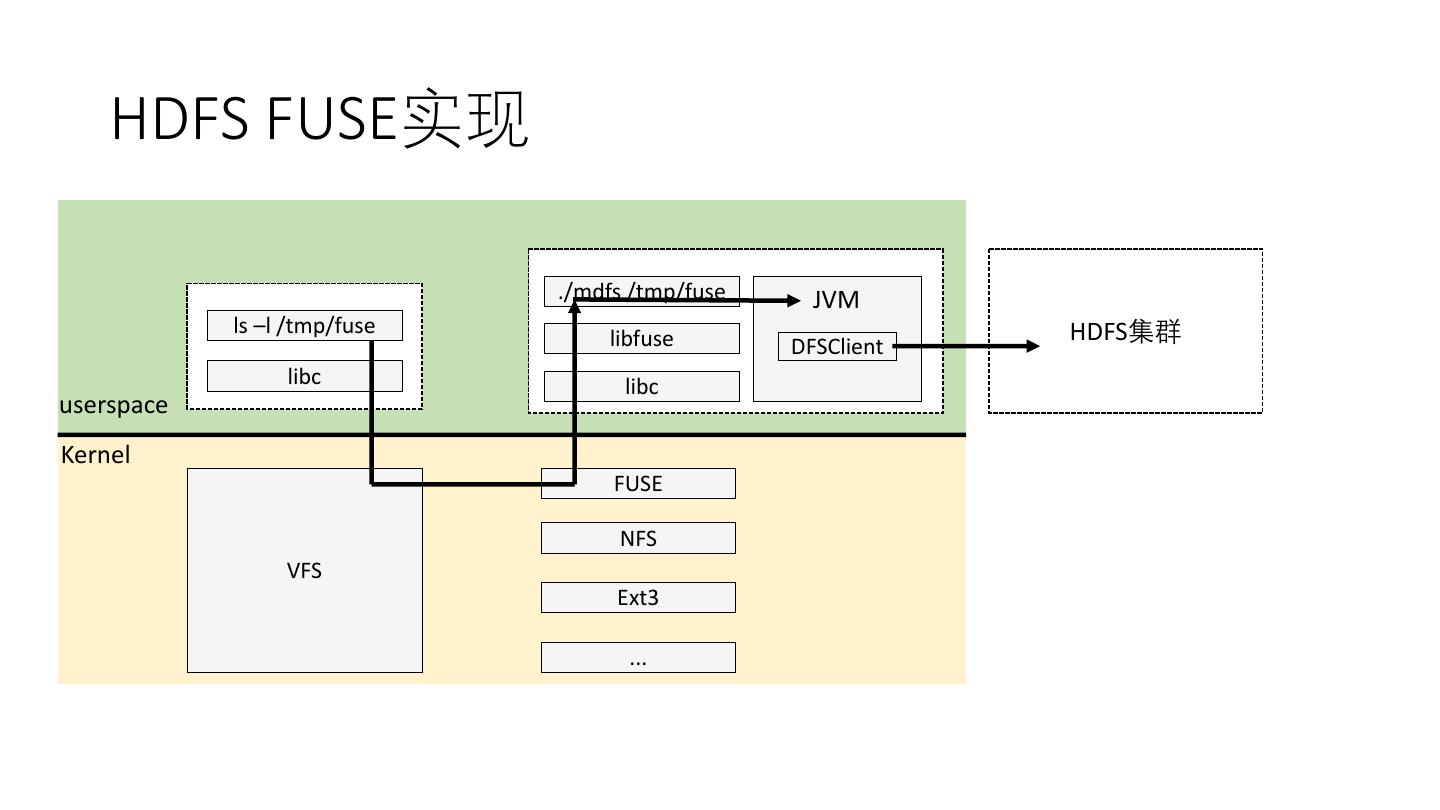 8 . HDFS FUSE实现 ./mdfs /tmp/fuse JVM ls –l /tmp/fuse HDFS集群 libfuse DFSClient libc libc userspace Kernel FUSE NFS VFS Ext3 ...