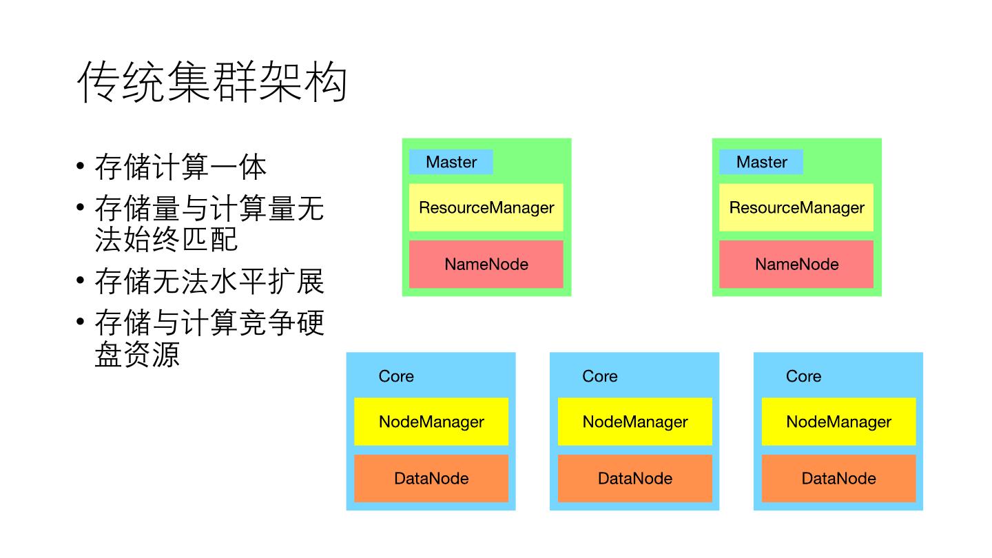 14 .传统集群架构 • 存储计算一体 • 存储量与计算量无 法始终匹配 • 存储无法水平扩展 • 存储与计算竞争硬 盘资源