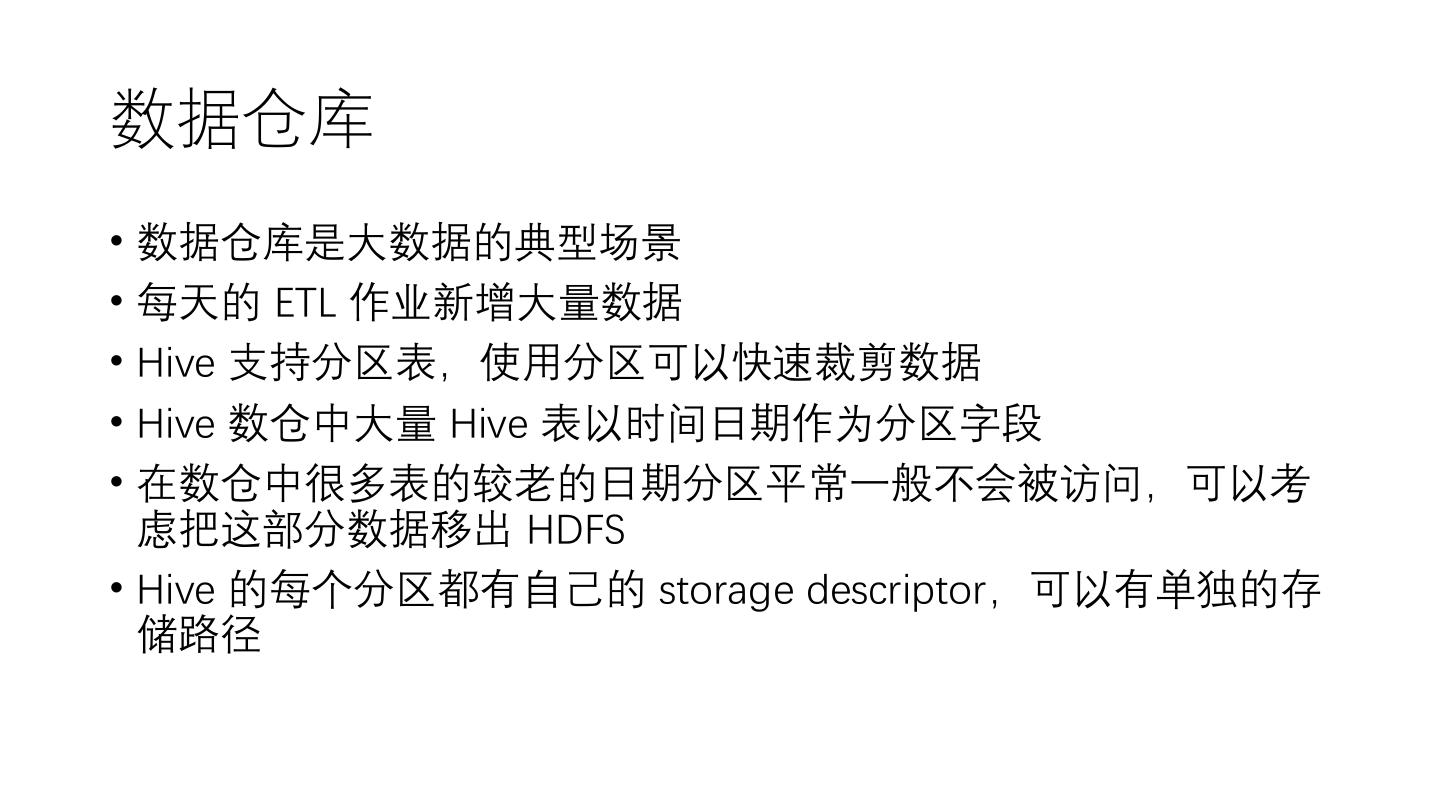 16 .数据仓库 • 数据仓库是大数据的典型场景 • 每天的 ETL 作业新增大量数据 • Hive 支持分区表,使用分区可以快速裁剪数据 • Hive 数仓中大量 Hive 表以时间日期作为分区字段 • 在数仓中很多表的较老的日期分区平常一般不会被访问,可以考 虑把这部分数据移出 HDFS • Hive 的每个分区都有自己的 storage descriptor,可以有单独的存 储路径