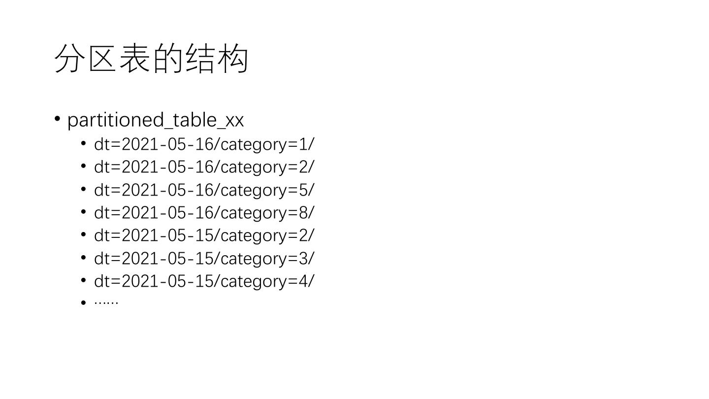 17 .分区表的结构 • partitioned_table_xx • dt=2021-05-16/category=1/ • dt=2021-05-16/category=2/ • dt=2021-05-16/category=5/ • dt=2021-05-16/category=8/ • dt=2021-05-15/category=2/ • dt=2021-05-15/category=3/ • dt=2021-05-15/category=4/ • ……