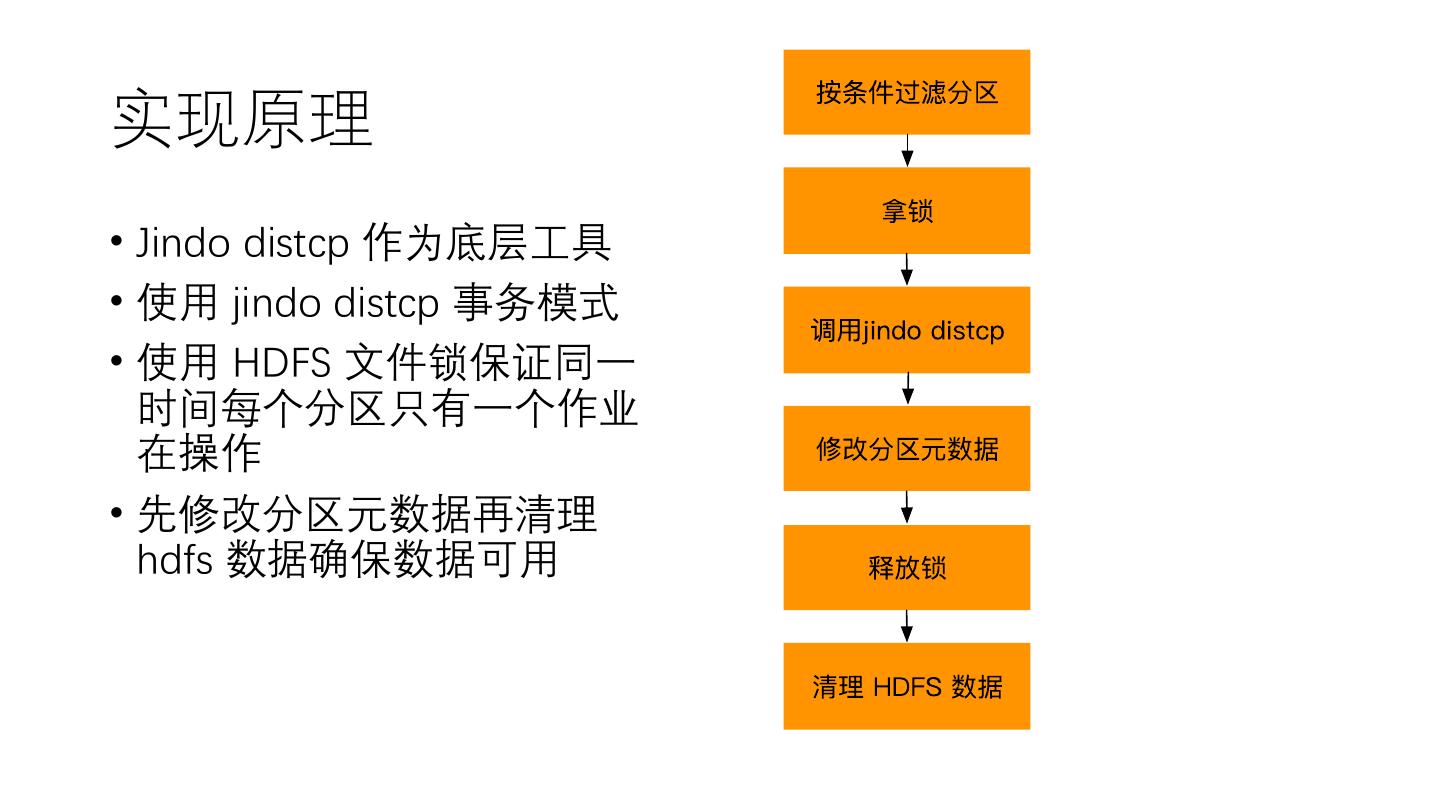 19 .实现原理 • Jindo distcp 作为底层工具 • 使用 jindo distcp 事务模式 • 使用 HDFS 文件锁保证同一 时间每个分区只有一个作业 在操作 • 先修改分区元数据再清理 hdfs 数据确保数据可用
