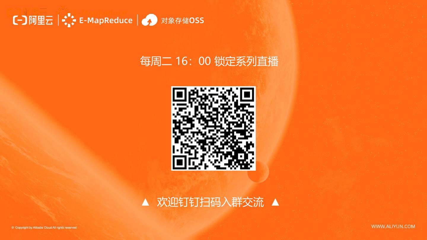 24 . E-MapReduce | E-MapReduce | 对象存储OSS 每周二 16:00 锁定系列直播 ▲ 欢迎钉钉扫码入群交流 ▲