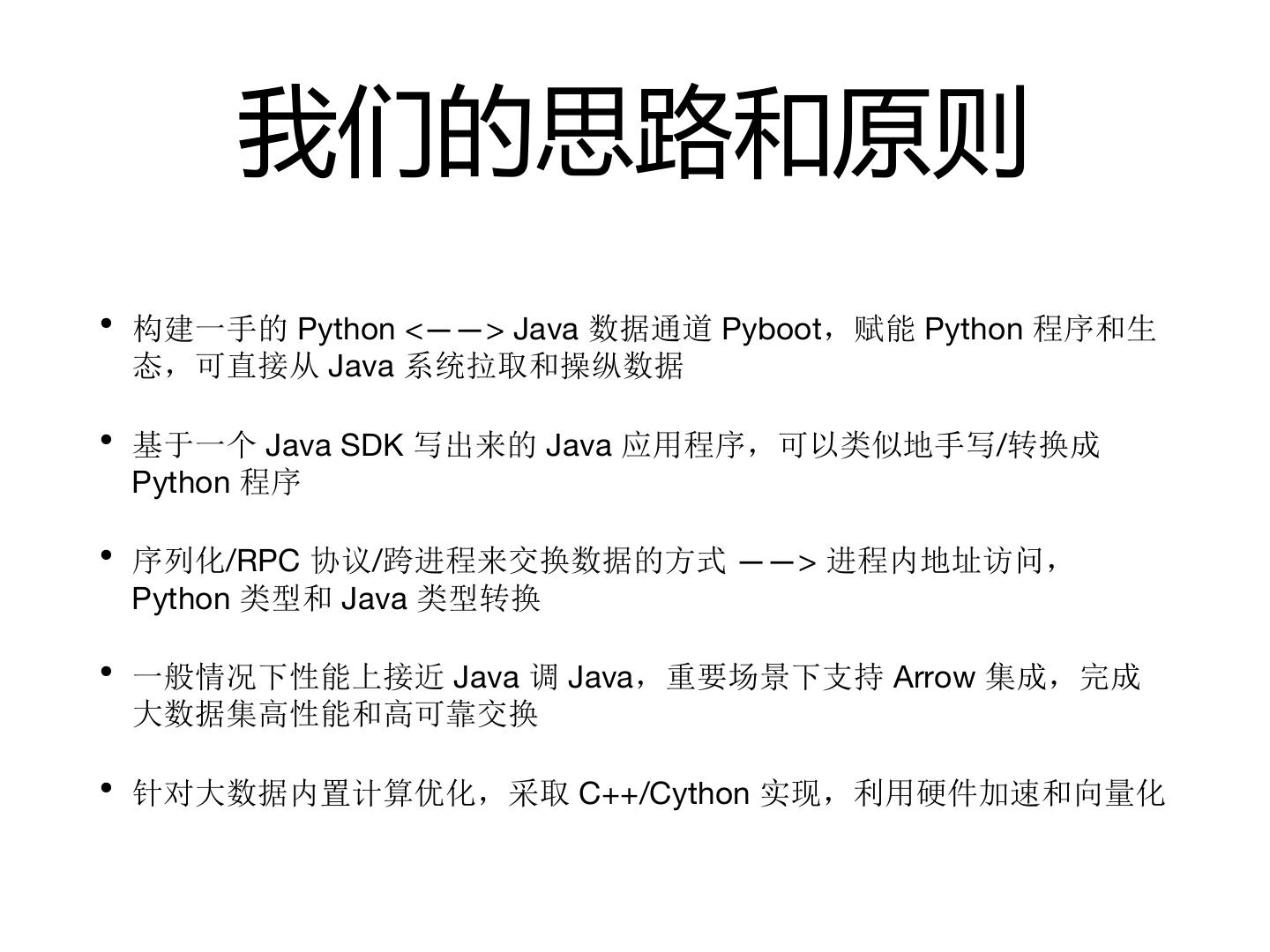 6 . 我们的思路和原则 • 构建一手的 Python <——> Java 数据通道 Pyboot,赋能 Python 程序和生 态,可直接从 Java 系统拉取和操纵数据 • 基于一个 Java SDK 写出来的 Java 应用程序,可以类似地手写/转换成 Python 程序 • 序列化/RPC 协议/跨进程来交换数据的方式 ——> 进程内地址访问, Python 类型和 Java 类型转换 • 一般情况下性能上接近 Java 调 Java,重要场景下支持 Arrow 集成,完成 大数据集高性能和高可靠交换 • 针对大数据内置计算优化,采取 C++/Cython 实现,利用硬件加速和向量化