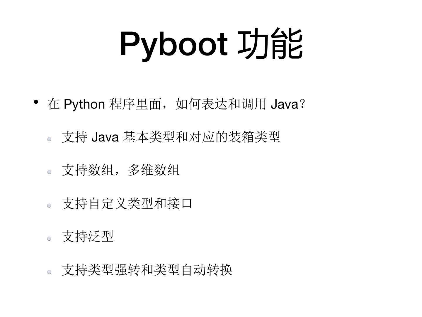 12 .Pyboot: Python 调用 Java 代码 import pyboot pyboot.initialize() jboot = pyboot.getJboot() jstr = jboot.String("Hello Pyboot!") jstr = jboot.java.lang.String("Hello Pyboot!")