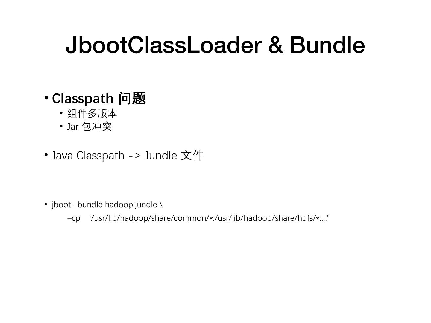 15 . JbootClassLoader & Bundle • Classpath 问题 • 组件多版本 • Jar 包冲突 • Java Classpath -> Jundle 文件 • jboot –bundle hadoop.jundle \ –cp “/usr/lib/hadoop/share/common/*:/usr/lib/hadoop/share/hdfs/*:...”
