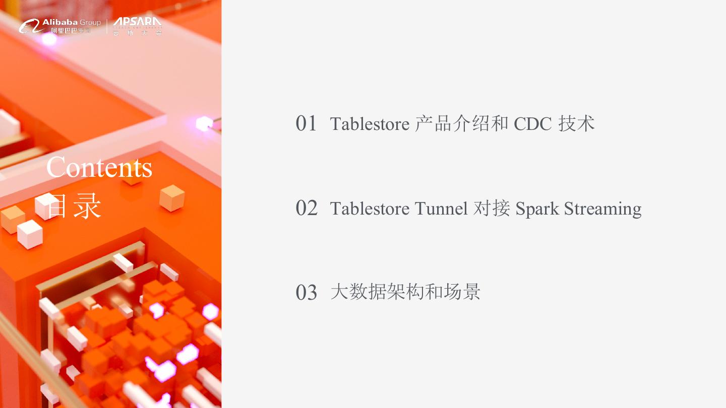 2 . 01 Tablestore 产品介绍和 CDC 技术 Contents 目录 02 Tablestore Tunnel 对接 Spark Streaming 03 大数据架构和场景