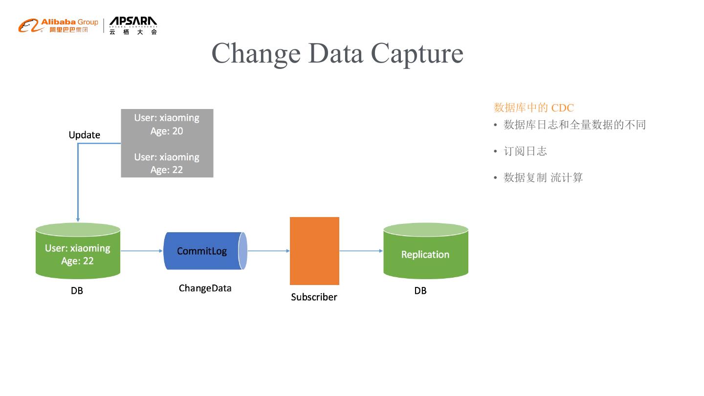 5 .Change Data Capture 数据库中的 CDC • 数据库日志和全量数据的不同 • 订阅日志 • 数据复制 流计算