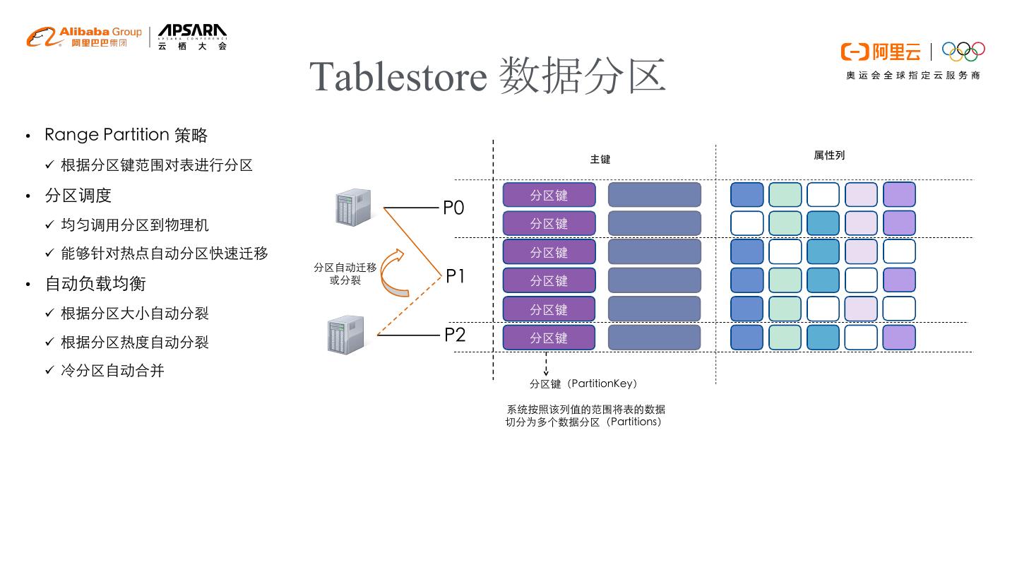 7 . Tablestore 数据分区 • Range Partition 策略 主键 属性列 ü 根据分区键范围对表进行分区 • 分区调度 分区键 P0 ü 均匀调用分区到物理机 分区键 ü 能够针对热点自动分区快速迁移 分区键 分区自动迁移 • 自动负载均衡 或分裂 P1 分区键 ü 根据分区大小自动分裂 分区键 ü 根据分区热度自动分裂 P2 分区键 ü 冷分区自动合并 分区键(PartitionKey) 系统按照该列值的范围将表的数据 切分为多个数据分区(Partitions)