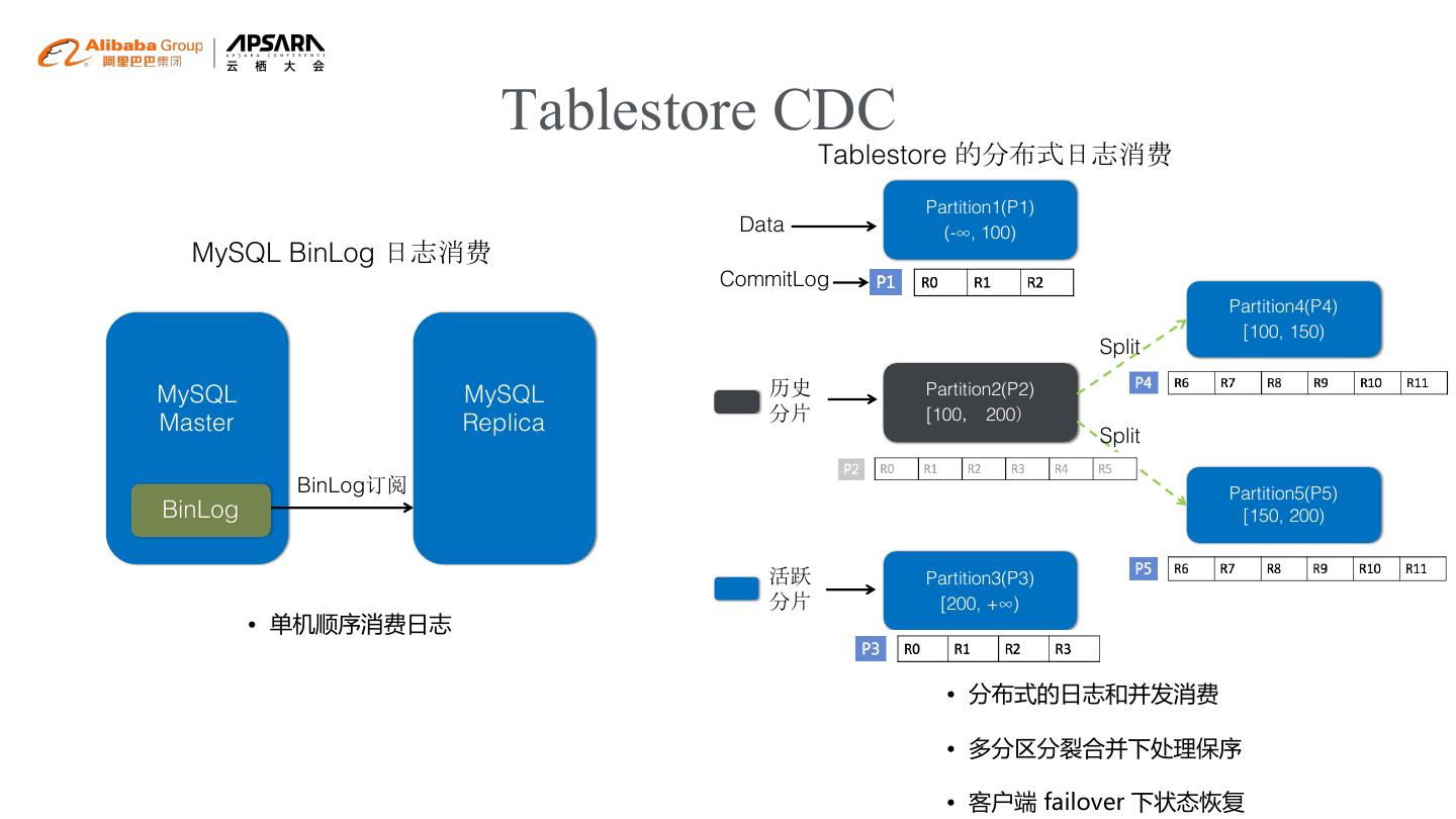 9 . Tablestore CDC Tablestore 的分布式日志消费 Partition1(P1) Data (-∞, 100) MySQL BinLog 日志消费 CommitLog Partition4(P4) [100, 150) Split MySQL MySQL 历史 Partition2(P2) Master Replica 分片 [100, 200) Split BinLog订阅 Partition5(P5) BinLog [150, 200) 活跃 Partition3(P3) 分片 [200, +∞) • 单机顺序消费日志 • 分布式的日志和并发消费 • 多分区分裂合并下处理保序 • 客户端 failover 下状态恢复