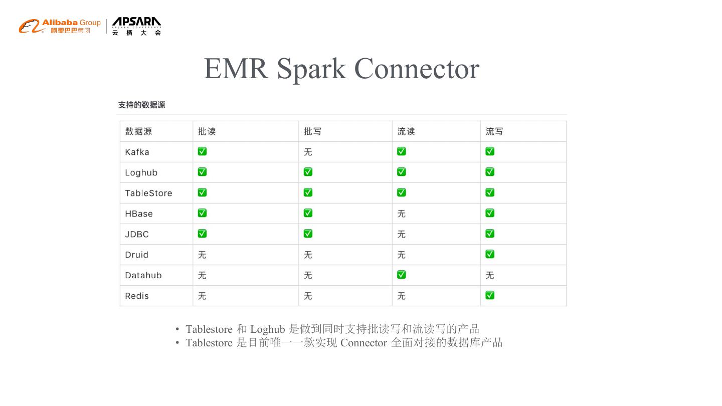 11 . EMR Spark Connector • Tablestore 和 Loghub 是做到同时支持批读写和流读写的产品 • Tablestore 是目前唯一一款实现 Connector 全面对接的数据库产品
