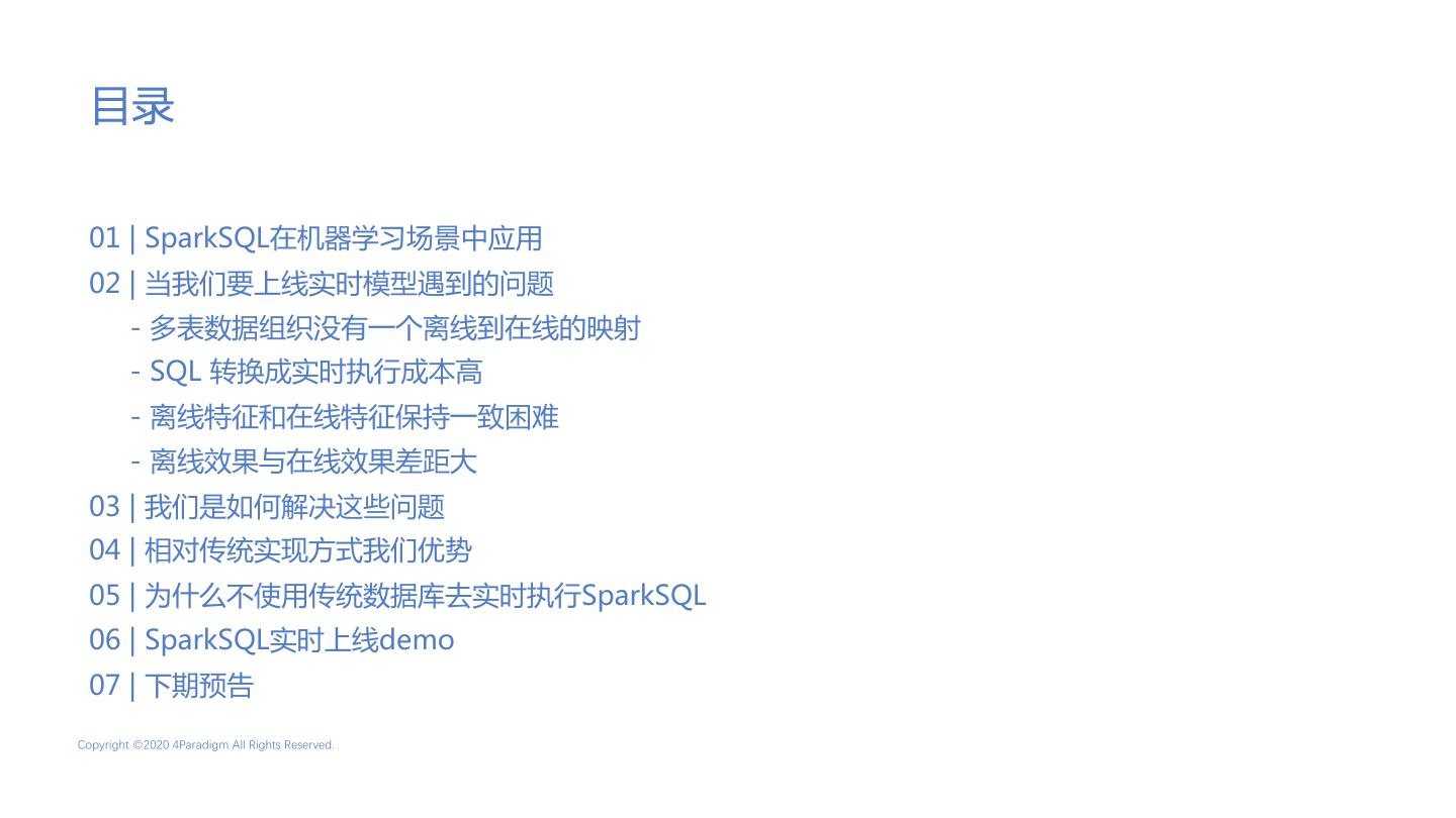 3 . 目录 01 | SparkSQL在机器学习场景中应用 02 | 当我们要上线实时模型遇到的问题 - 多表数据组织没有一个离线到在线的映射 - SQL 转换成实时执行成本高 - 离线特征和在线特征保持一致困难 - 离线效果与在线效果差距大 03 | 我们是如何解决这些问题 04 | 相对传统实现方式我们优势 05 | 为什么不使用传统数据库去实时执行SparkSQL 06 | SparkSQL实时上线demo 07 | 下期预告 Copyright ©2020 4Paradigm All Rights Reserved.