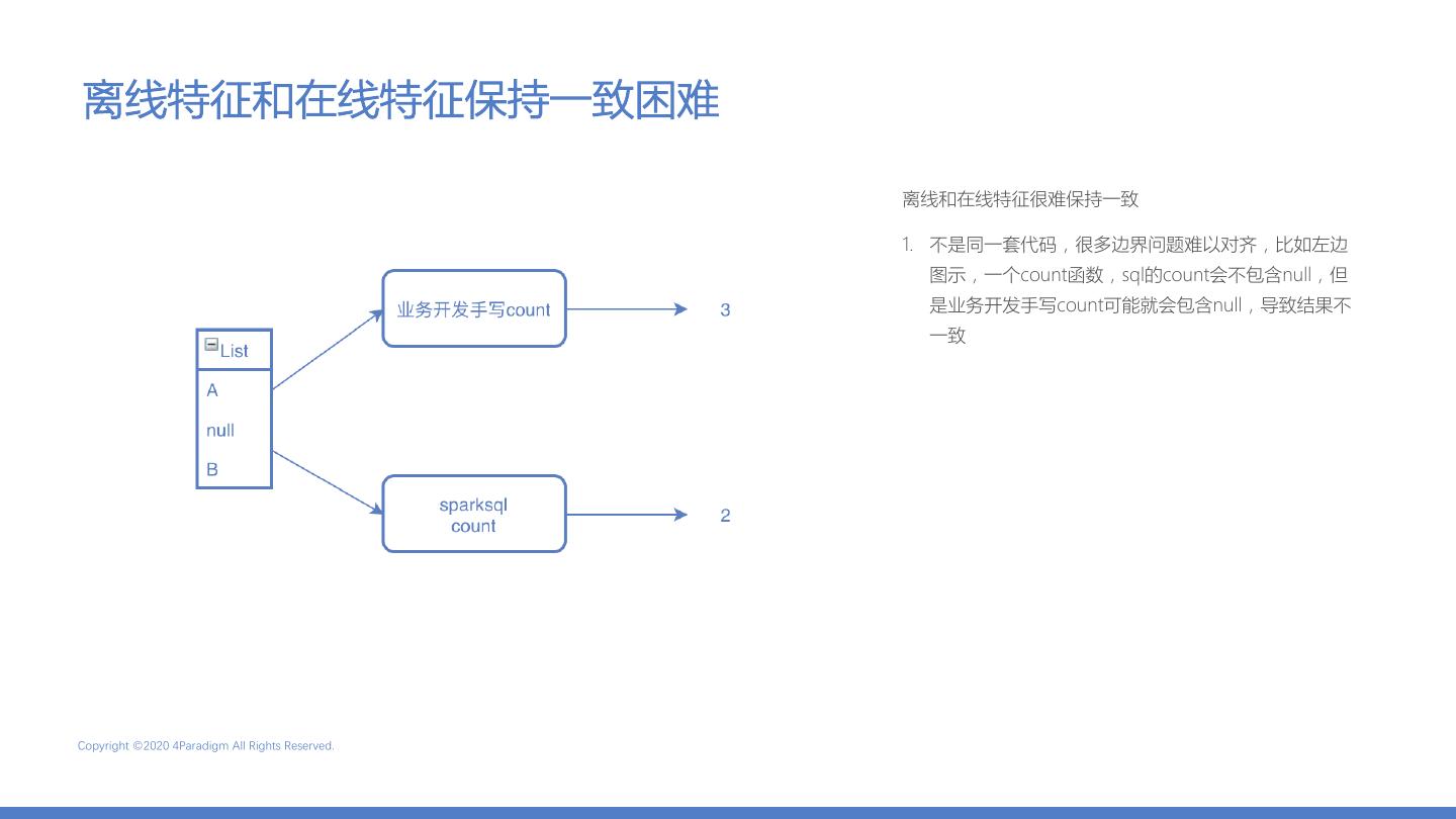 8 .离线特征和在线特征保持一致困难 离线和在线特征很难保持一致 1. 不是同一套代码,很多边界问题难以对齐,比如左边 图示,一个count函数,sql的count会不包含null,但 是业务开发手写count可能就会包含null,导致结果不 一致 Copyright ©2020 4Paradigm All Rights Reserved.