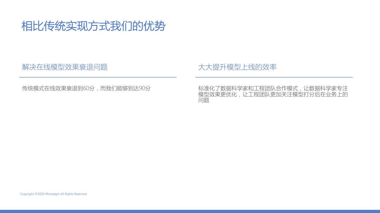11 .相比传统实现方式我们的优势 解决在线模型效果衰退问题 大大提升模型上线的效率 传统模式在线效果衰退到60分,而我们能够到达90分 标准化了数据科学家和工程团队合作模式,让数据科学家专注 模型效果更优化,让工程团队更加关注模型打分后在业务上的 问题 Copyright ©2020 4Paradigm All Rights Reserved.