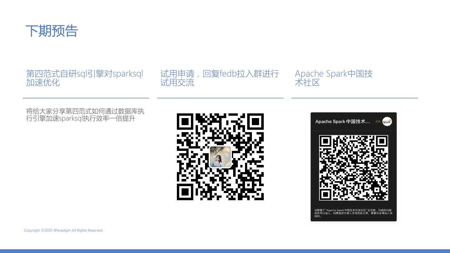 14 .下期预告 第四范式自研sql引擎对sparksql 试用申请,回复fedb拉入群进行 Apache Spark中国技 加速优化 试用交流 术社区 将给大家分享第四范式如何通过数据库执 行引擎加速sparksql执行效率一倍提升 Copyright ©2020 4Paradigm All Rights Reserved.