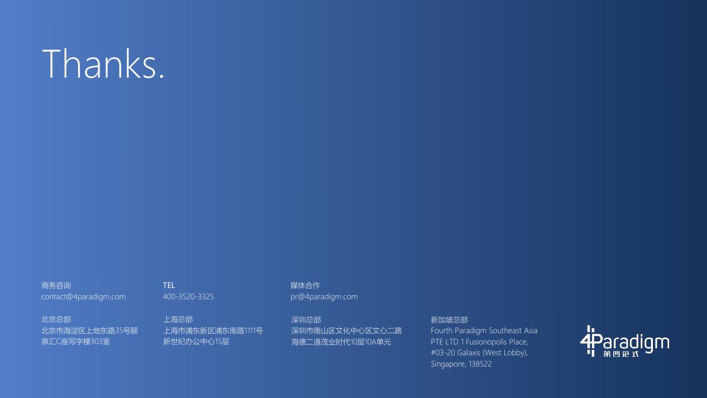 15 .Thanks. 商务咨询 TEL 媒体合作 contact@4paradigm.com 400-3520-3325 pr@4paradigm.com 北京总部 上海总部 深圳总部 新加坡总部 北京市海淀区上地东路35号颐 上海市浦东新区浦东南路1111号 深圳市南山区文化中心区文心二路 Fourth Paradigm Southeast Asia 泉汇C座写字楼303室 新世纪办公中心15层 海德二道茂业时代10层10A单元 PTE LTD 1 Fusionopolis Place, #03-20 Galaxis (West Lobby), Singapore, 138522