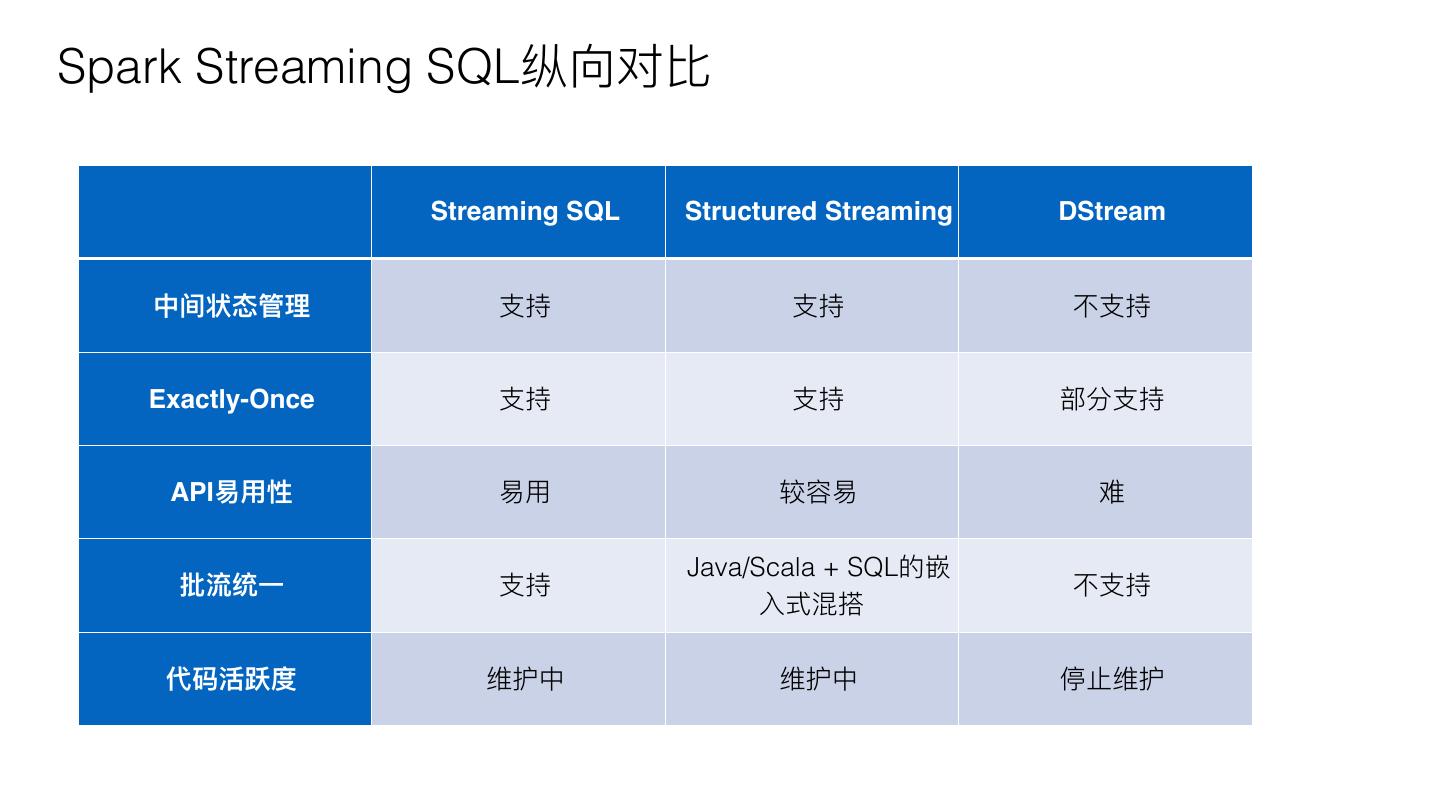 6 .Spark Streaming SQL纵向对⽐比 Streaming SQL Structured Streaming DStream 中间状态管理理 ⽀支持 ⽀支持 不不⽀支持 Exactly-Once ⽀支持 ⽀支持 部分⽀支持 API易易⽤用性 易易⽤用 较容易易 难 Java/Scala + SQL的嵌 批流统⼀一 ⽀支持 不不⽀支持 ⼊入式混搭 代码活跃度 维护中 维护中 停⽌止维护