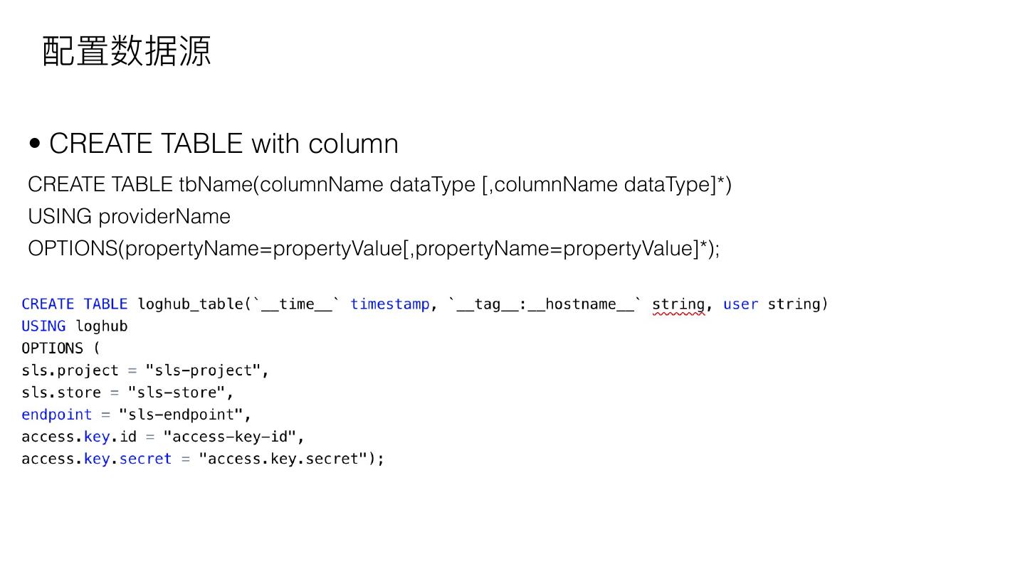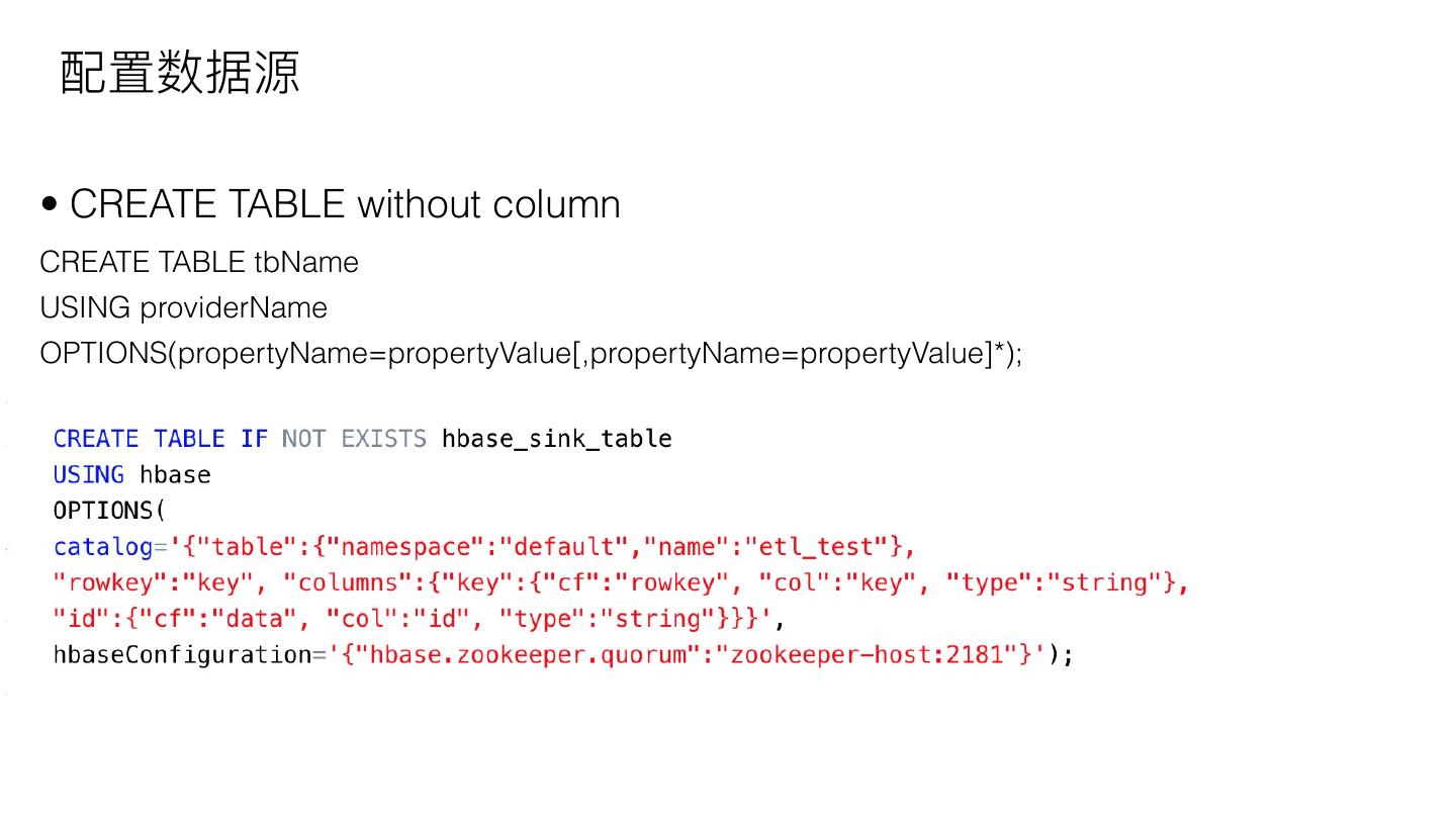 10 . 配置数据源 • CREATE TABLE with column CREATE TABLE tbName(columnName dataType [,columnName dataType]*) USING providerName OPTIONS(propertyName=propertyValue[,propertyName=propertyValue]*);
