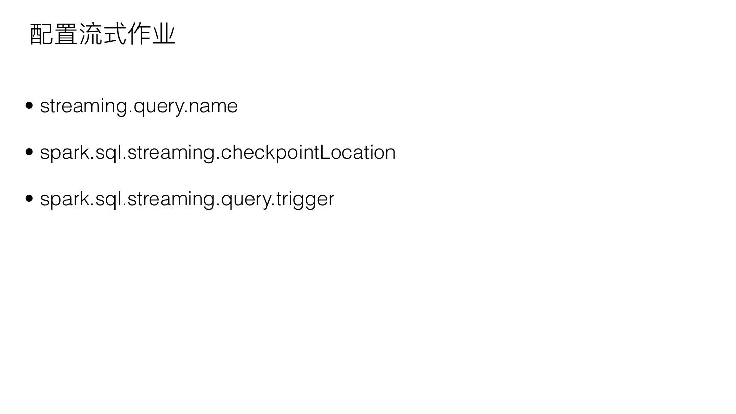 13 .配置流式作业 • streaming.query.name • spark.sql.streaming.checkpointLocation • spark.sql.streaming.query.trigger