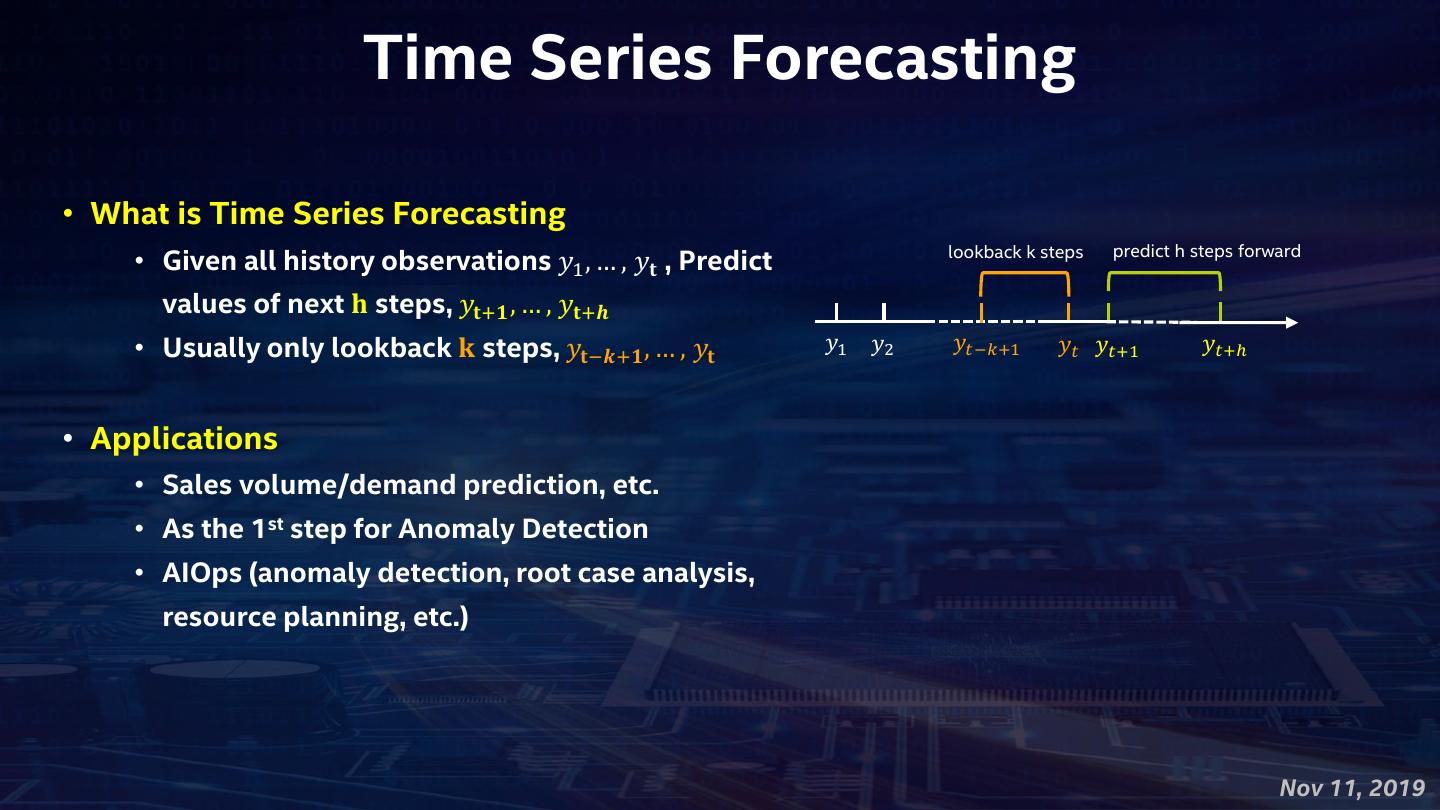 10 . Time Series Forecasting • What is Time Series Forecasting lookback k steps predict h steps forward • Given all history observations 𝑦1 , … , 𝑦𝐭 , Predict values of next 𝐡 steps, 𝑦𝐭+𝟏 , … , 𝑦𝐭+𝒉 • Usually only lookback 𝐤 steps, 𝑦𝐭−𝒌+𝟏 , … , 𝑦𝐭 𝑦1 𝑦2 𝑦𝑡−𝑘+1 𝑦𝑡 𝑦𝑡+1 𝑦𝑡+ℎ • Applications • Sales volume/demand prediction, etc. • As the 1st step for Anomaly Detection • AIOps (anomaly detection, root case analysis, resource planning, etc.) Nov 11, 2019