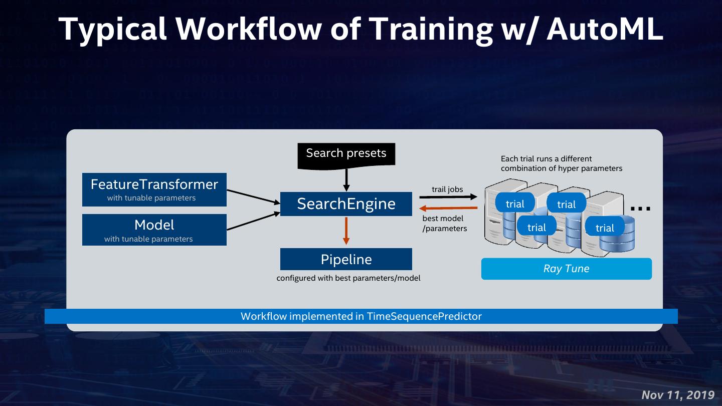 15 .Typical Workflow of Training w/ AutoML Search presets Each trial runs a different combination of hyper parameters FeatureTransformer … trail jobs with tunable parameters SearchEngine trial trial best model Model /parameters trial trial with tunable parameters Pipeline Ray Tune configured with best parameters/model Workflow implemented in TimeSequencePredictor Nov 11, 2019