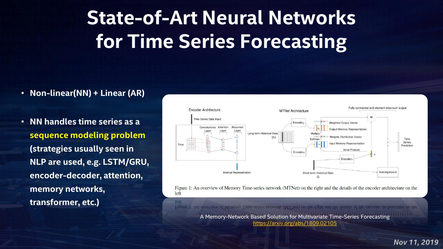 17 . State-of-Art Neural Networks for Time Series Forecasting • Non-linear(NN) + Linear (AR) • NN handles time series as a sequence modeling problem (strategies usually seen in NLP are used, e.g. LSTM/GRU, encoder-decoder, attention, memory networks, transformer, etc.) A Memory-Network Based Solution for Multivariate Time-Series Forecasting https://arxiv.org/abs/1809.02105 Nov 11, 2019