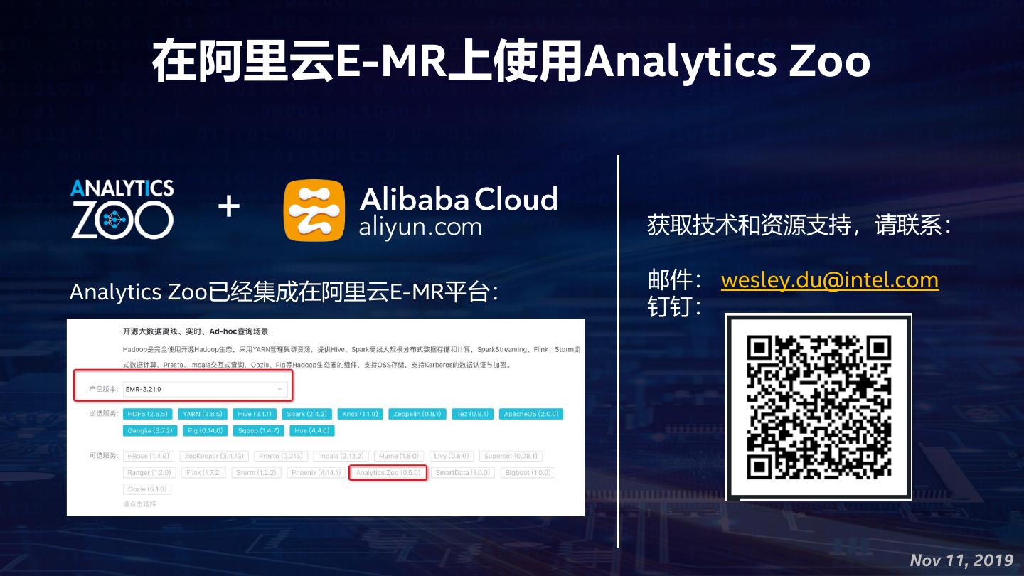 20 . 在阿里云E-MR上使用Analytics Zoo + 获取技术和资源支持,请联系: 邮件: wesley.du@intel.com Analytics Zoo已经集成在阿里云E-MR平台: 钉钉: Nov 11, 2019