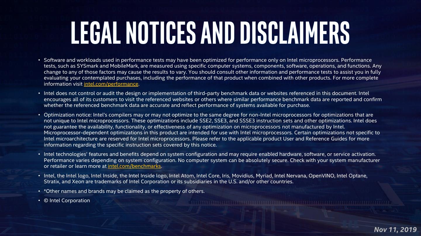 22 .• Software and workloads used in performance tests may have been optimized for performance only on Intel microprocessors. Performance tests, such as SYSmark and MobileMark, are measured using specific computer systems, components, software, operations, and functions. Any change to any of those factors may cause the results to vary. You should consult other information and performance tests to assist you in fully evaluating your contemplated purchases, including the performance of that product when combined with other products. For more complete information visit intel.com/performance. • Intel does not control or audit the design or implementation of third-party benchmark data or websites referenced in this document. Intel encourages all of its customers to visit the referenced websites or others where similar performance benchmark data are reported and confirm whether the referenced benchmark data are accurate and reflect performance of systems available for purchase. • Optimization notice: Intel’s compilers may or may not optimize to the same degree for non-Intel microprocessors for optimizations that are not unique to Intel microprocessors. These optimizations include SSE2, SSE3, and SSSE3 instruction sets and other optimizations. Intel does not guarantee the availability, functionality, or effectiveness of any optimization on microprocessors not manufactured by Intel. Microprocessor-dependent optimizations in this product are intended for use with Intel microprocessors. Certain optimizations not specific to Intel microarchitecture are reserved for Intel microprocessors. Please refer to the applicable product User and Reference Guides for more information regarding the specific instruction sets covered by this notice. • Intel technologies’ features and benefits depend on system configuration and may require enabled hardware, software, or service activation. Performance varies depending on system configuration. No computer system can be absolutely secure. Check with your system manufacturer or retailer or learn more at intel.com/benchmarks. • Intel, the Intel logo, Intel Inside, the Intel Inside logo, Intel Atom, Intel Core, Iris, Movidius, Myriad, Intel Nervana, OpenVINO, Intel Optane, Stratix, and Xeon are trademarks of Intel Corporation or its subsidiaries in the U.S. and/or other countries. • *Other names and brands may be claimed as the property of others. • © Intel Corporation Nov 11, 2019