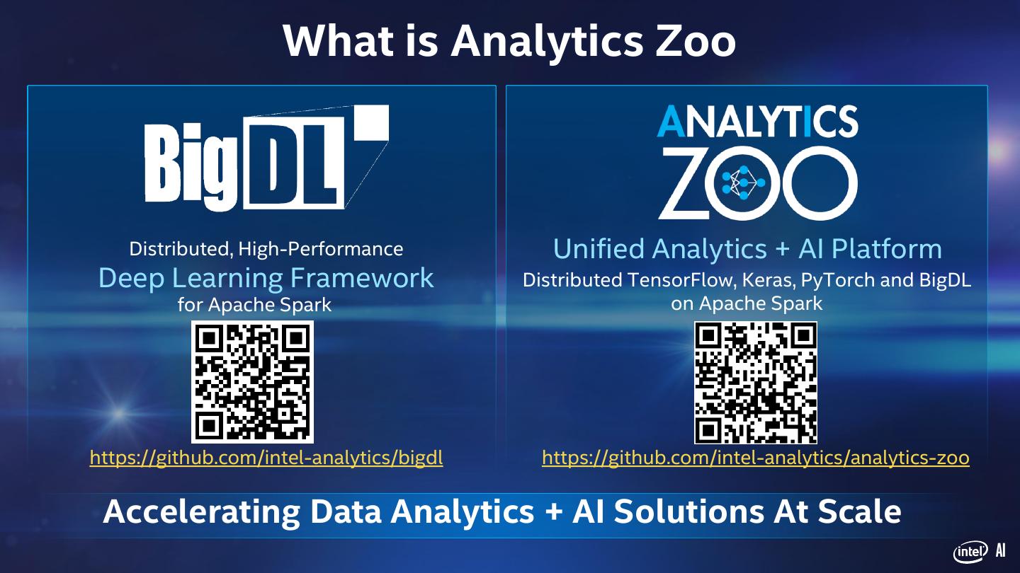 5 . What is Analytics Zoo Distributed, High-Performance Unified Analytics + AI Platform Deep Learning Framework Distributed TensorFlow, Keras, PyTorch and BigDL for Apache Spark on Apache Spark https://github.com/intel-analytics/bigdl https://github.com/intel-analytics/analytics-zoo Accelerating Data Analytics + AI Solutions At Scale AI