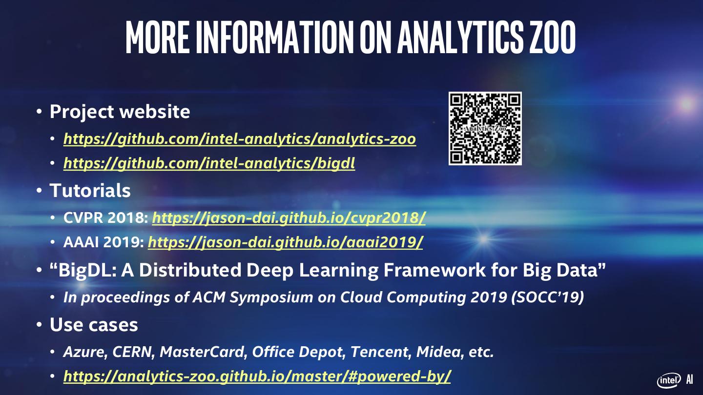 9 . More Information on Analytics Zoo • Project website • https://github.com/intel-analytics/analytics-zoo • https://github.com/intel-analytics/bigdl • Tutorials • CVPR 2018: https://jason-dai.github.io/cvpr2018/ • AAAI 2019: https://jason-dai.github.io/aaai2019/ • “BigDL: A Distributed Deep Learning Framework for Big Data” • In proceedings of ACM Symposium on Cloud Computing 2019 (SOCC’19) • Use cases • Azure, CERN, MasterCard, Office Depot, Tencent, Midea, etc. • https://analytics-zoo.github.io/master/#powered-by/ AI