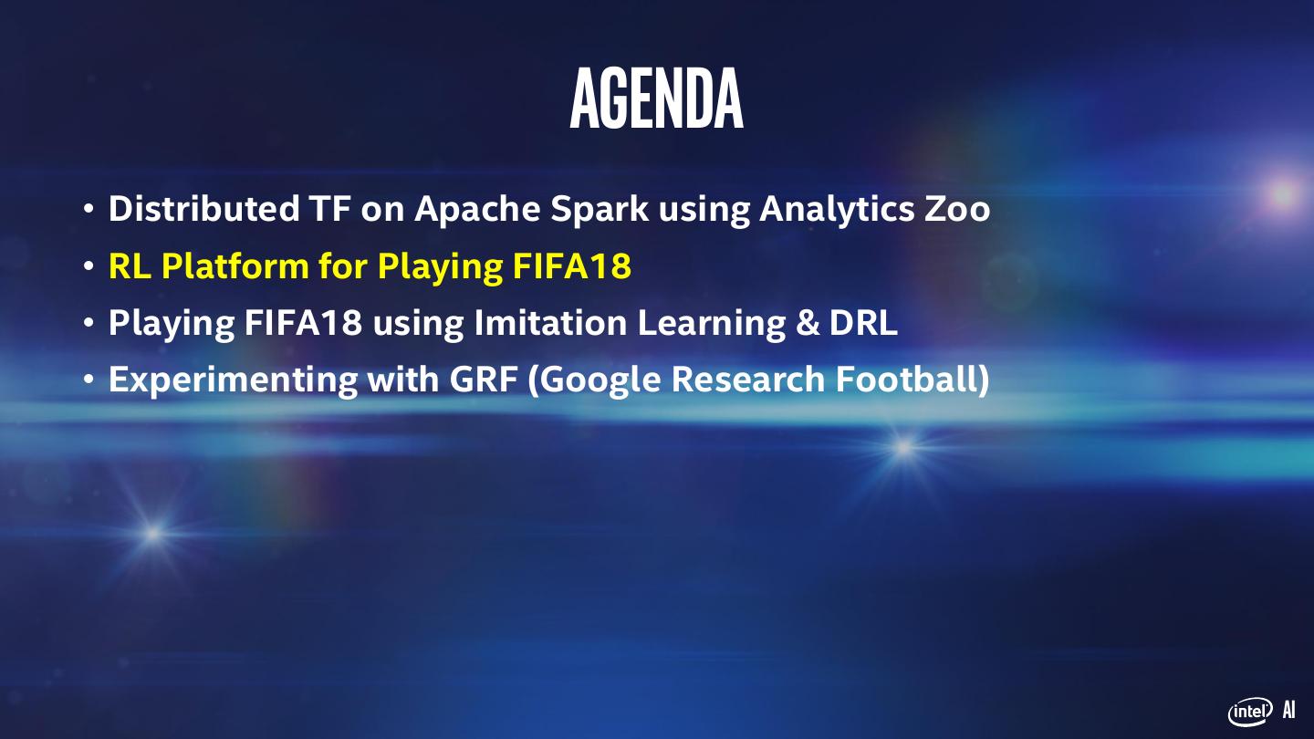 16 . Agenda • Distributed TF on Apache Spark using Analytics Zoo • RL Platform for Playing FIFA18 • Playing FIFA18 using Imitation Learning & DRL • Experimenting with GRF (Google Research Football) AI