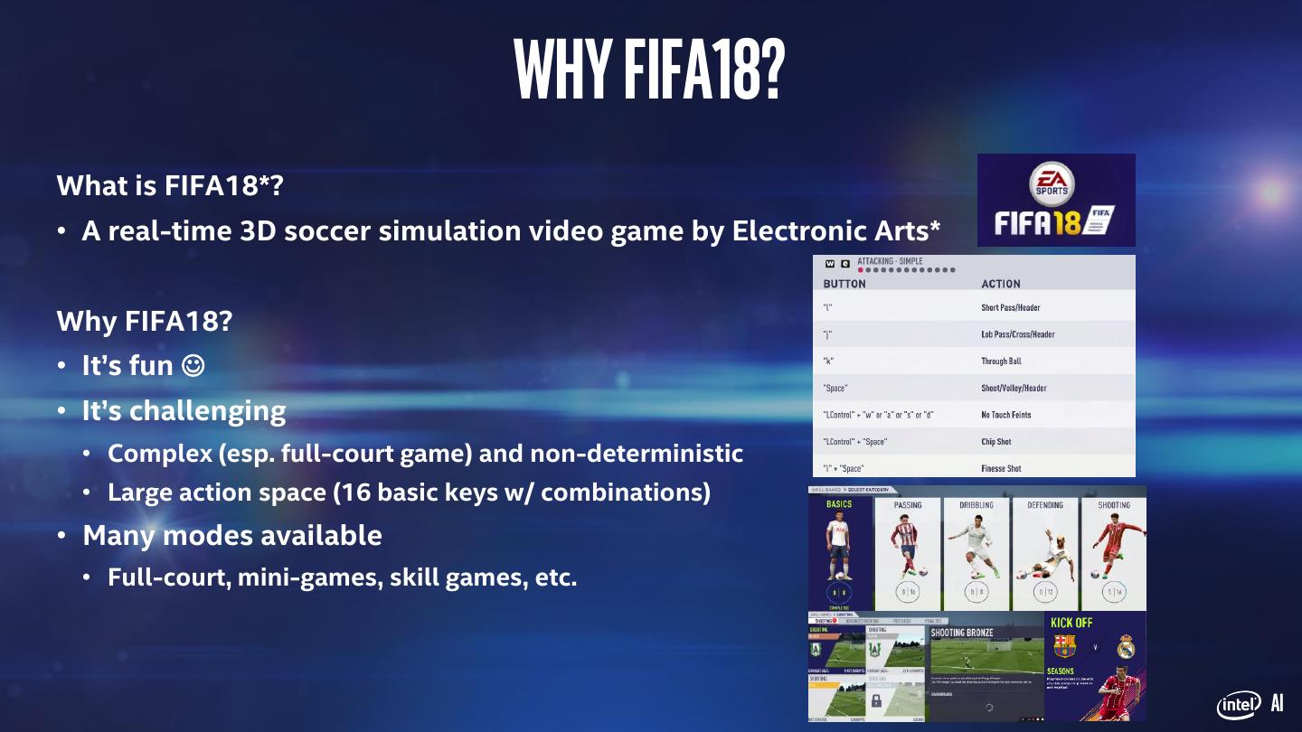 11 . Why FIFA18? What is FIFA18*? • A real-time 3D soccer simulation video game by Electronic Arts* Why FIFA18? • It’s fun ☺ • It’s challenging • Complex (esp. full-court game) and non-deterministic • Large action space (16 basic keys w/ combinations) • Many modes available • Full-court, mini-games, skill games, etc. AI